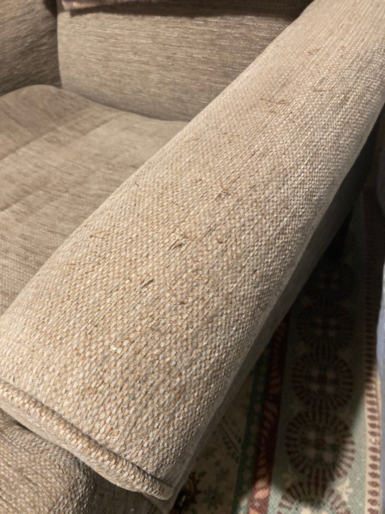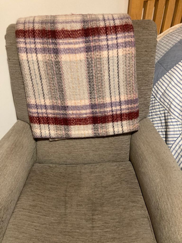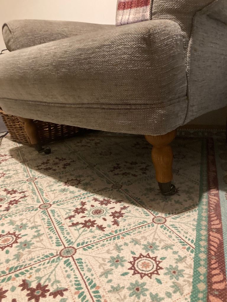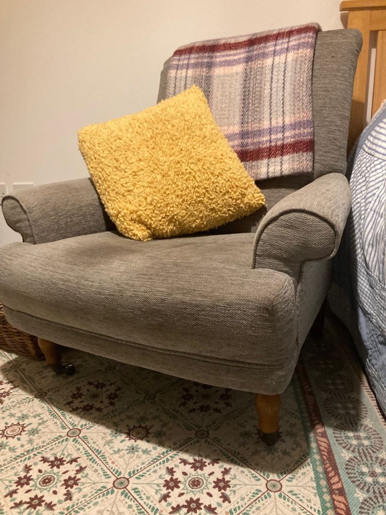 Very Comfortable chair in grey fabric. Very slight damage on armrest. Had this for several years but moved house so no room for this chair. Wood legs with brass wheels at front.