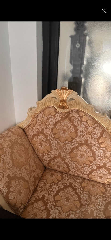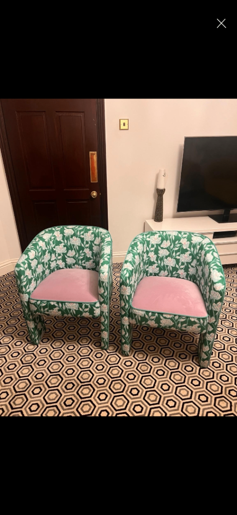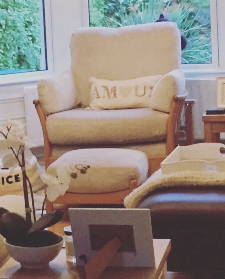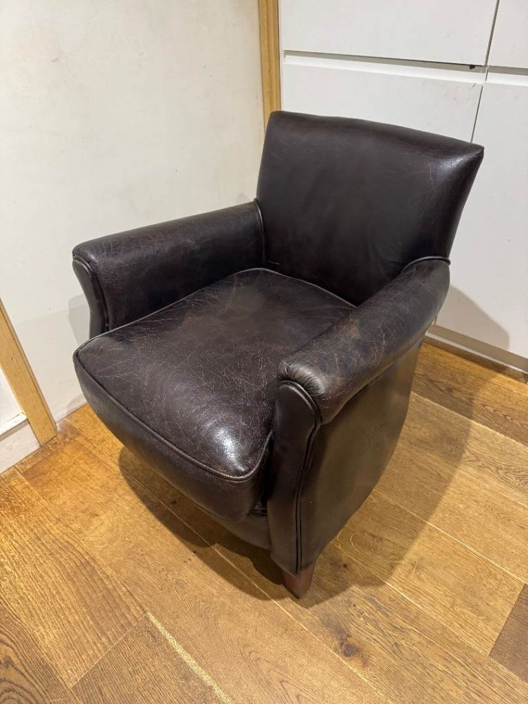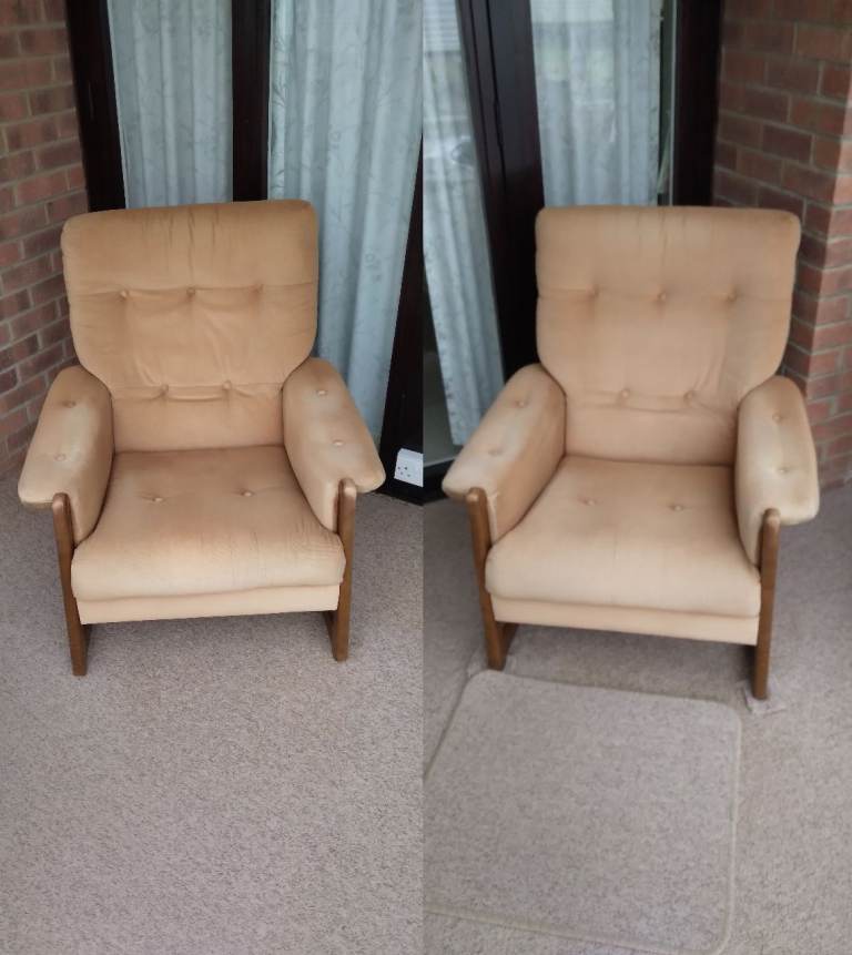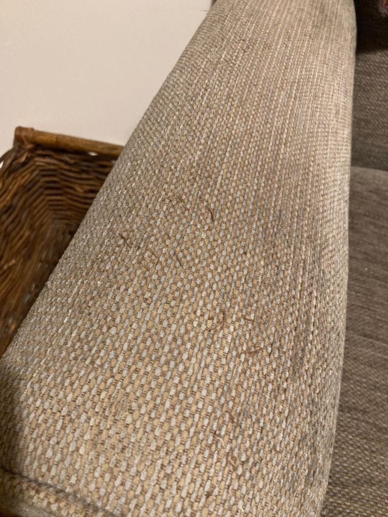 Very Comfortable chair in grey fabric. Very slight damage on armrest. Had this for several years but moved house so no room for this chair. Wood legs with brass wheels at front.