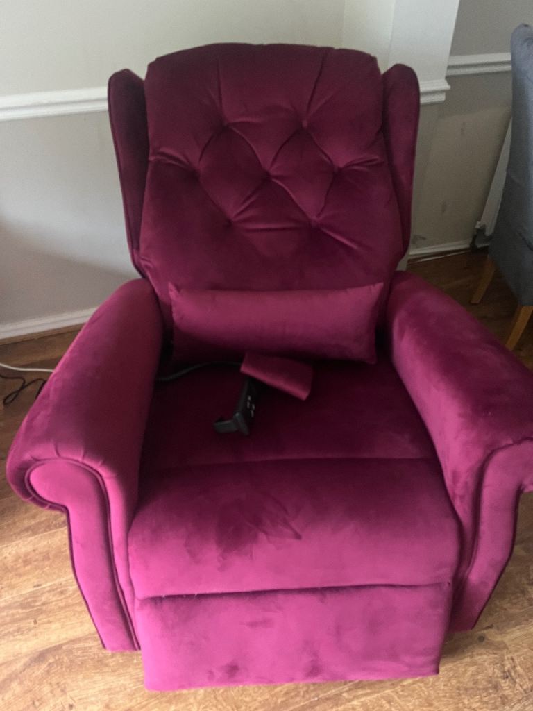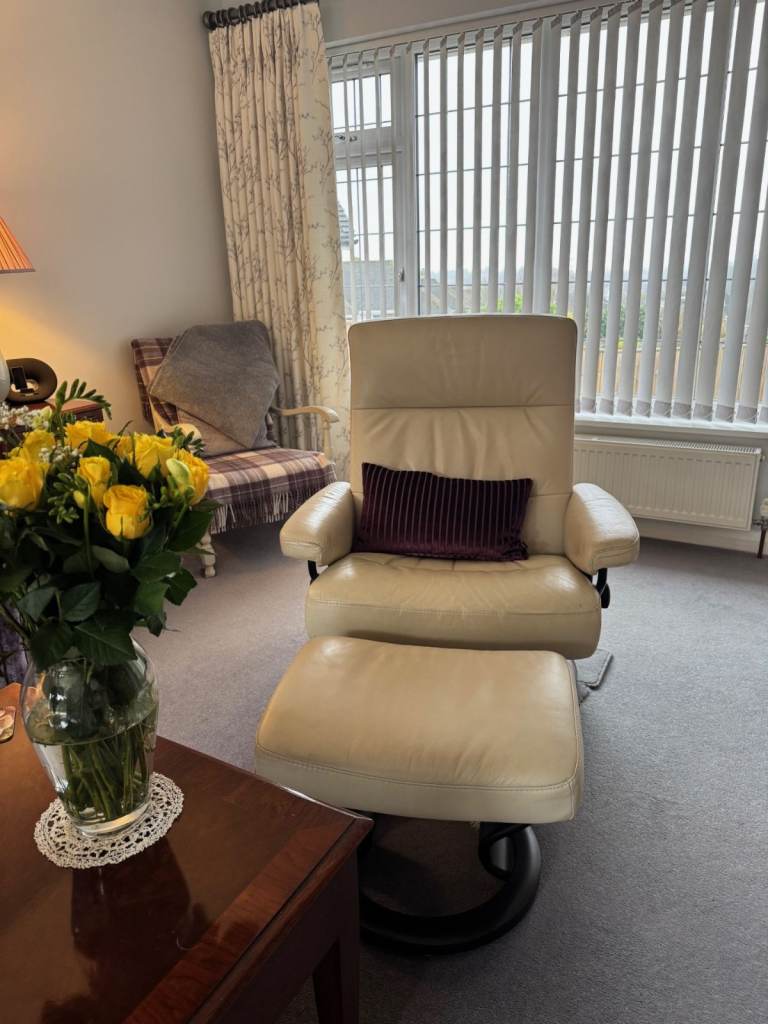 This chair has a supportive high back, curved arms, and a deep cushioned seat — ideal for relaxing, reading, or watching TV. Neutral fabric works well with any décor style.