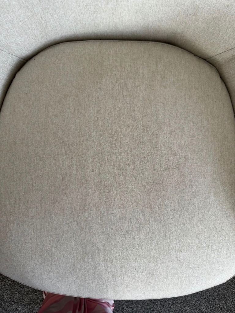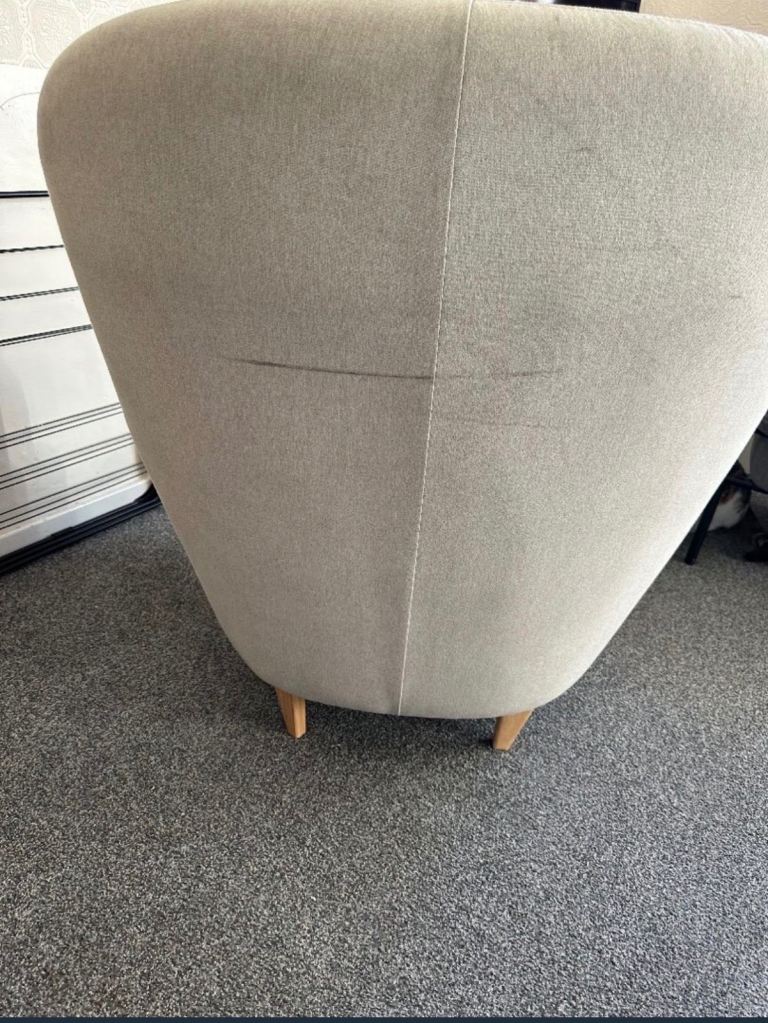 There is a light mark on the back of the chair (shown in the photo). It happened while bringing it into the house. It doesn’t affect the comfort or look from the front and should be easily cleanable.