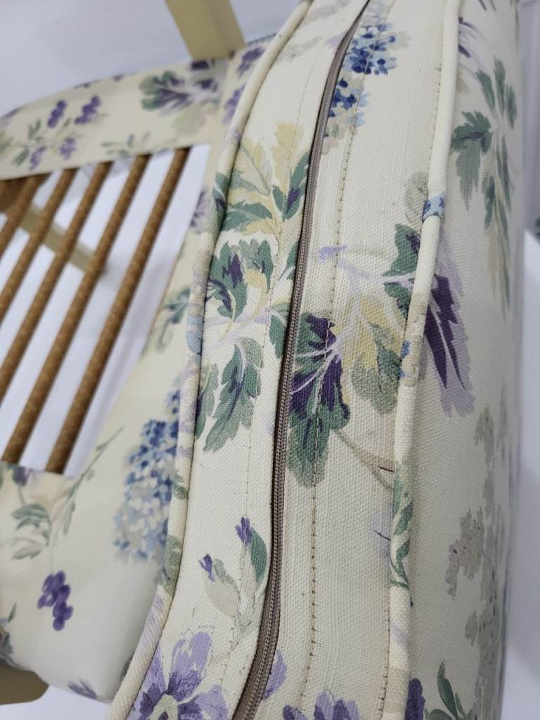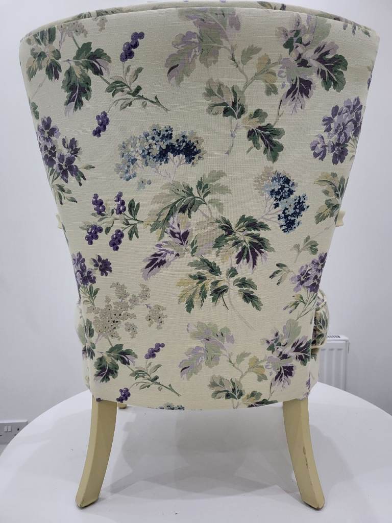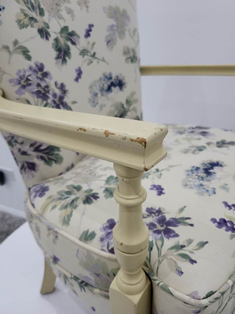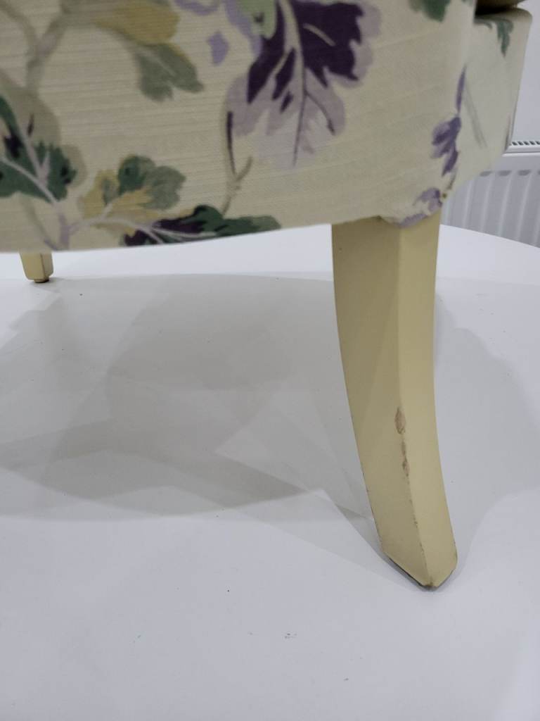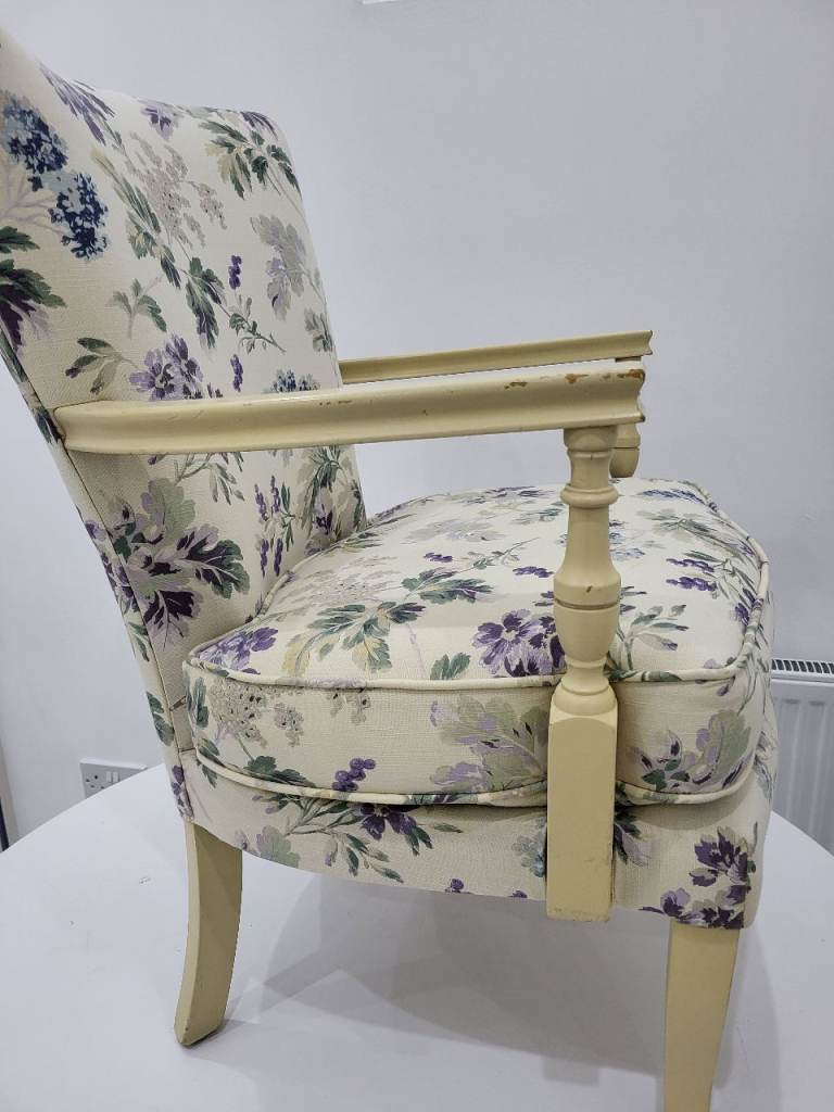 Lovely chair in Laura Ashley fabric. Cream wooden arms and legs. Cushion cover is removable with a zip fastening. There is a few scratches on the arms and legs, as seen in the last two photos.