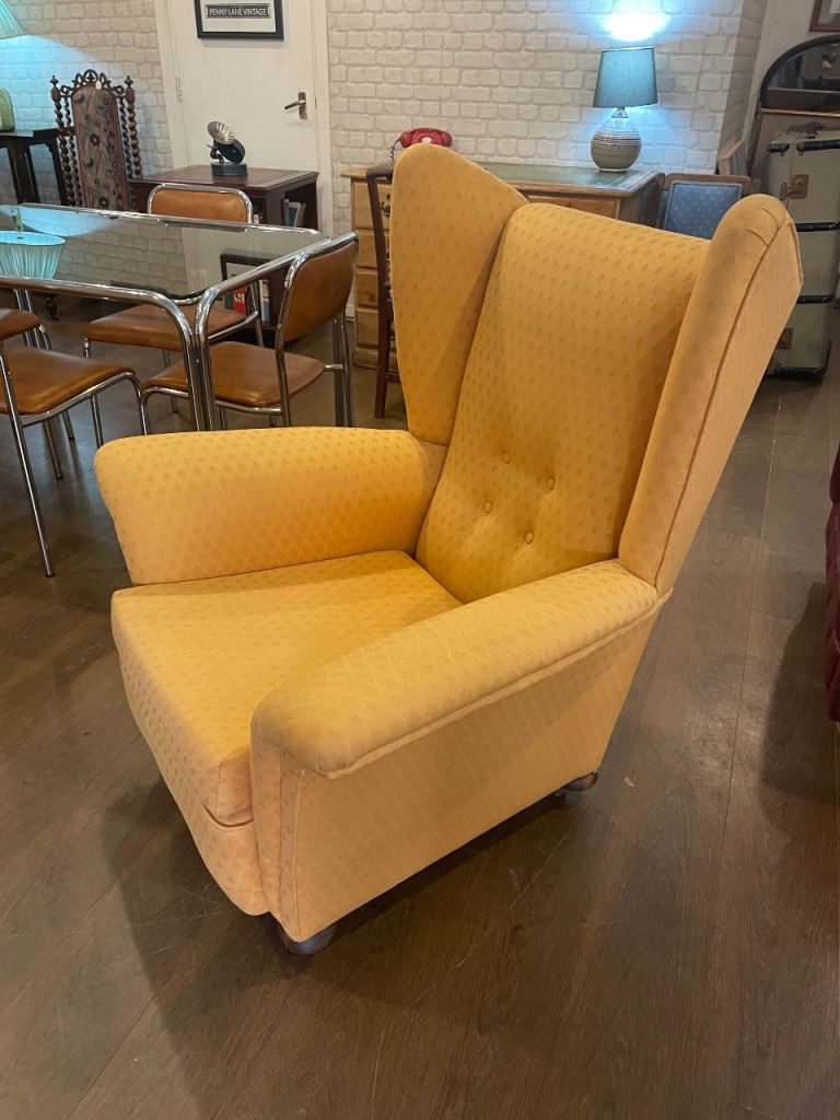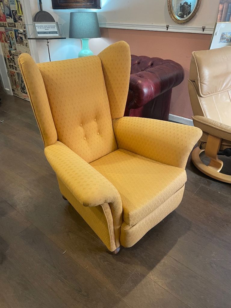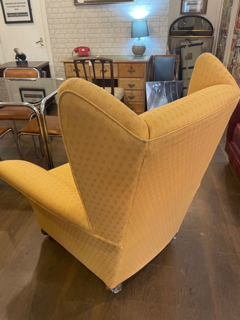 Armchair in lovely yellow gold coloured fabric. Extremely comfortable & in very good clean condition. Size 97 cm w x 108 cm d x 118 h