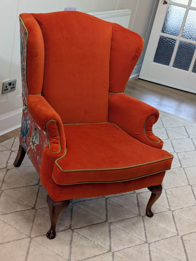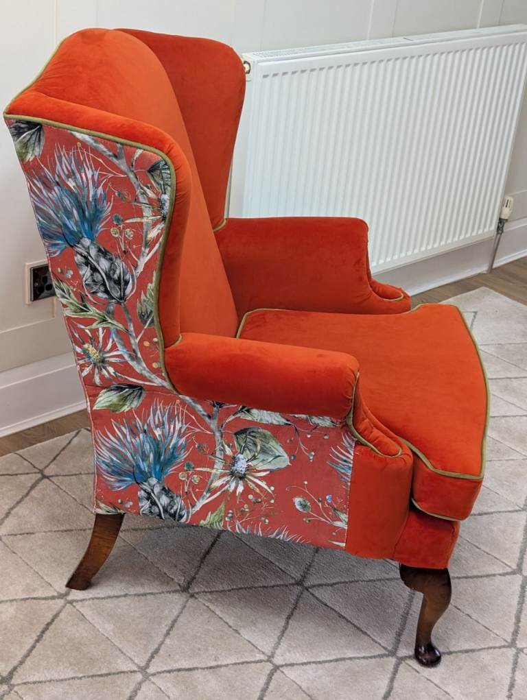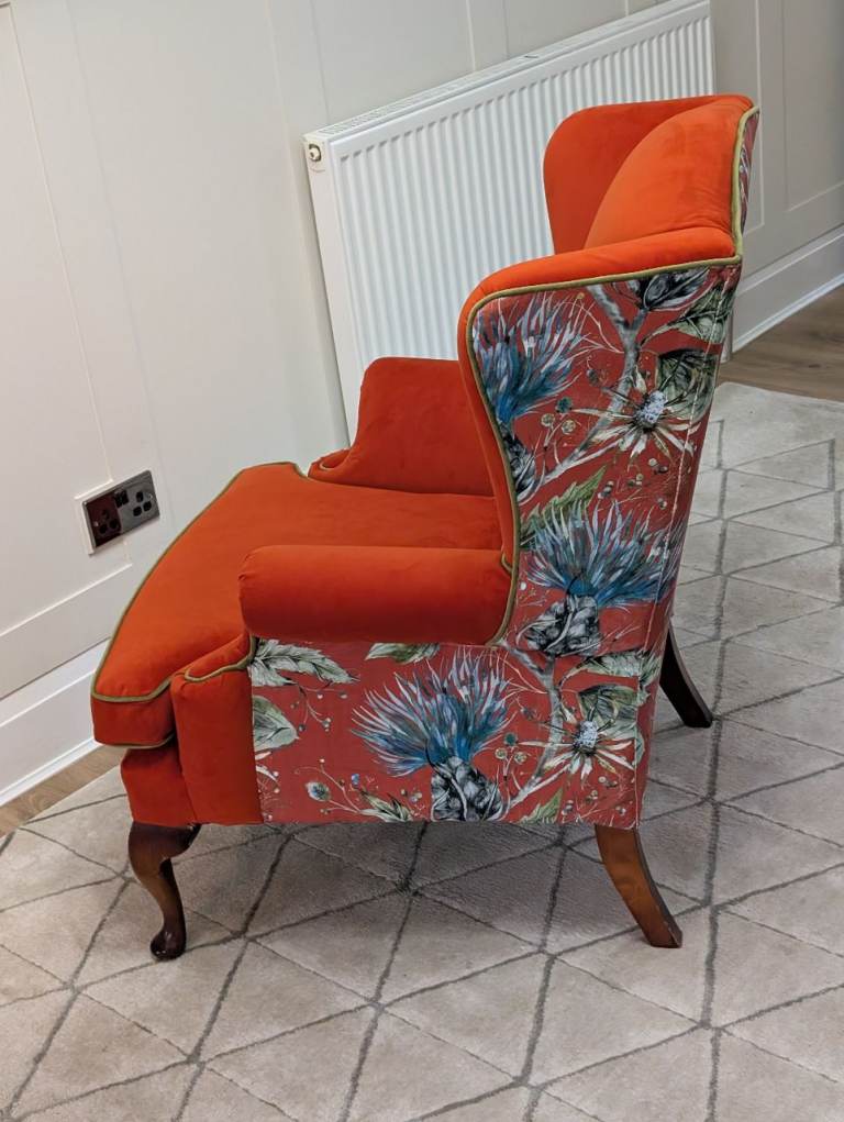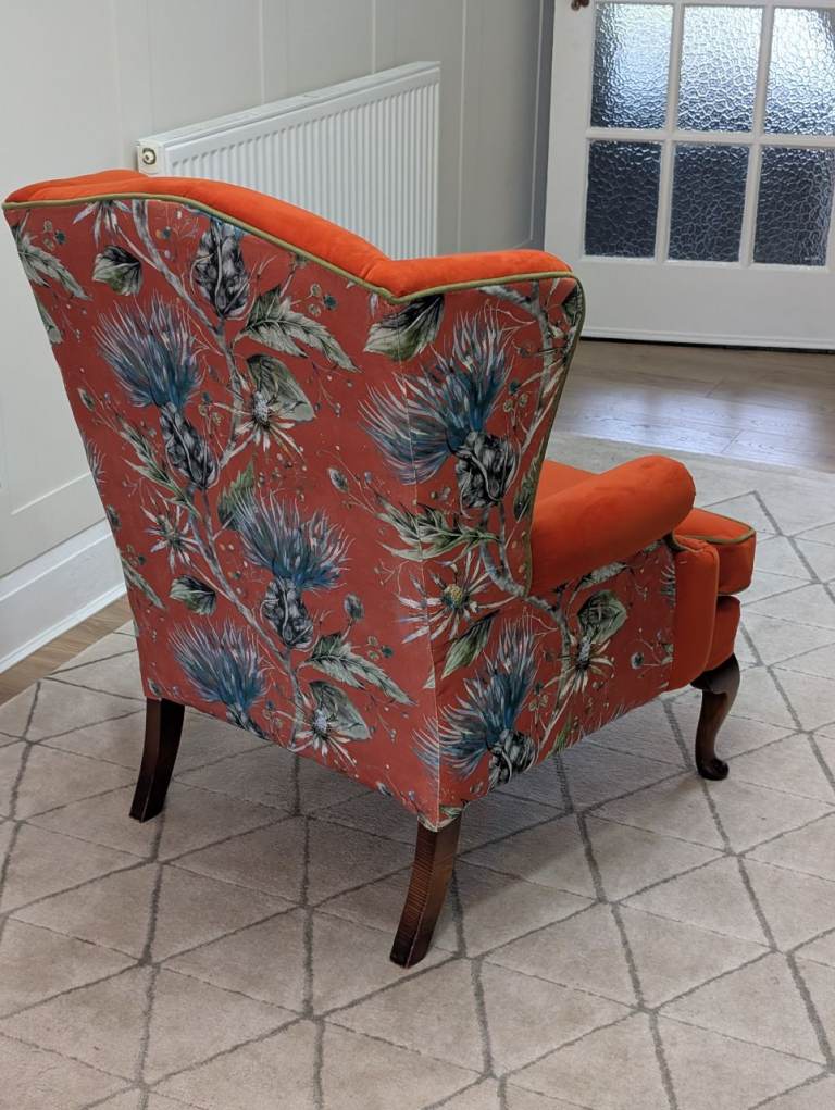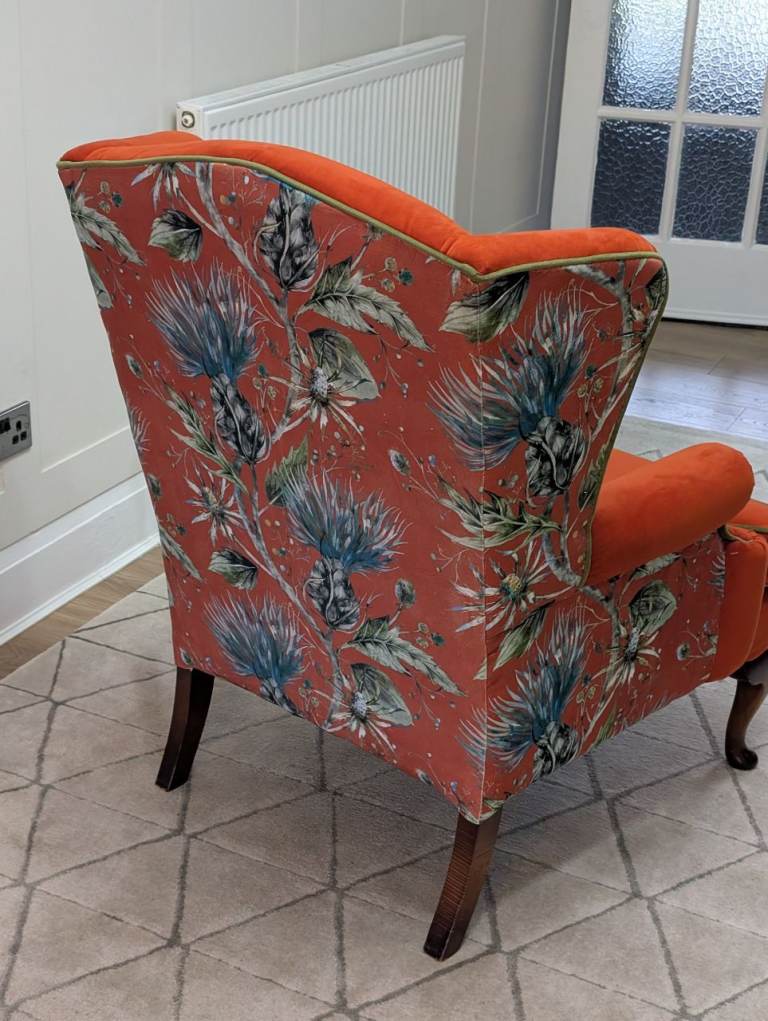Beautifully finished in a Paprika red velvet with complimenting thistle pattern velvet on the back of the chair with olive green velvet piping.