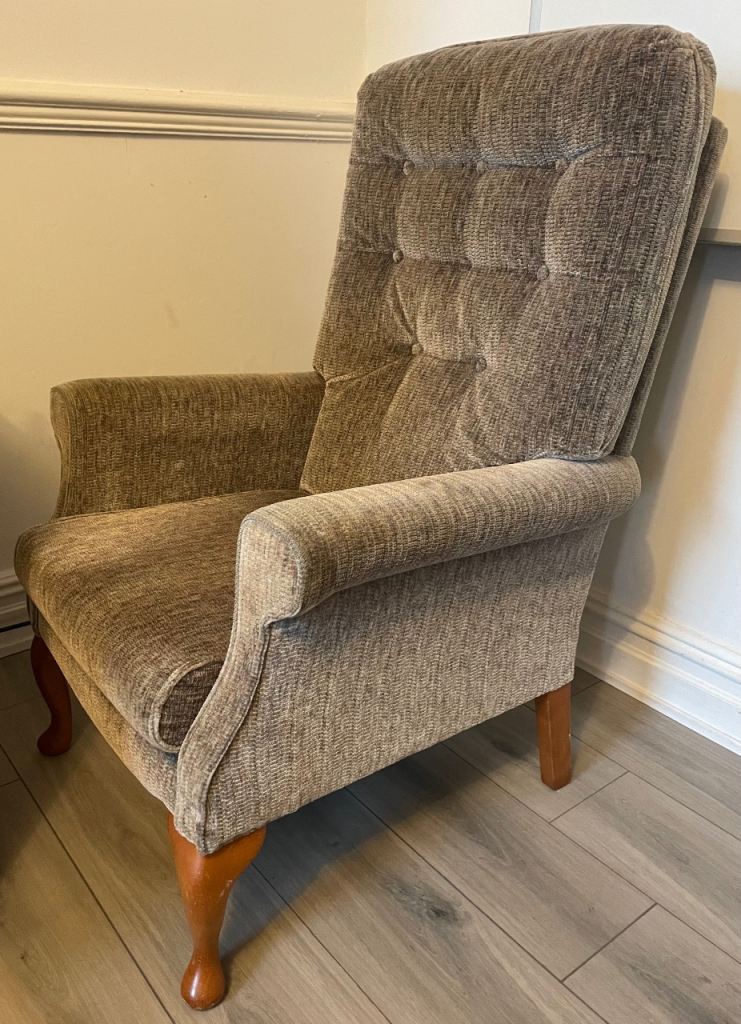 This item is a fireside armchair, a type of furniture designed to be more supportive than standard armchairs. It features a high, buttoned back, padded scroll arms, and curved Queen Anne-style wooden legs.