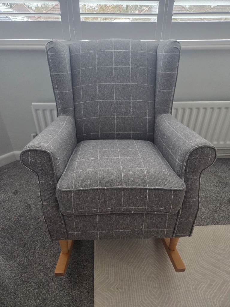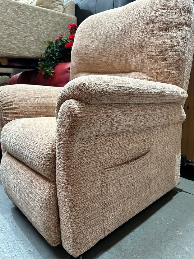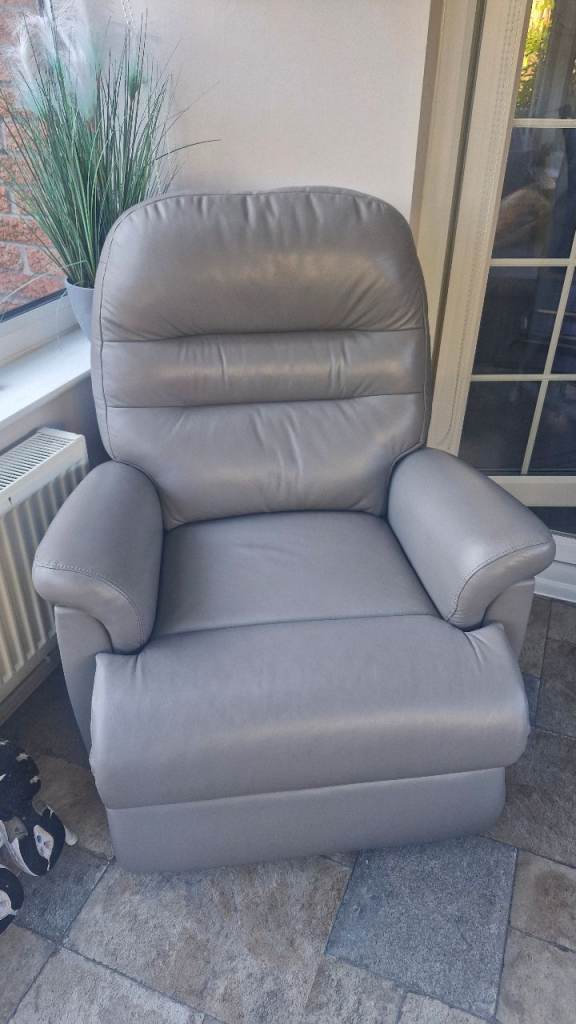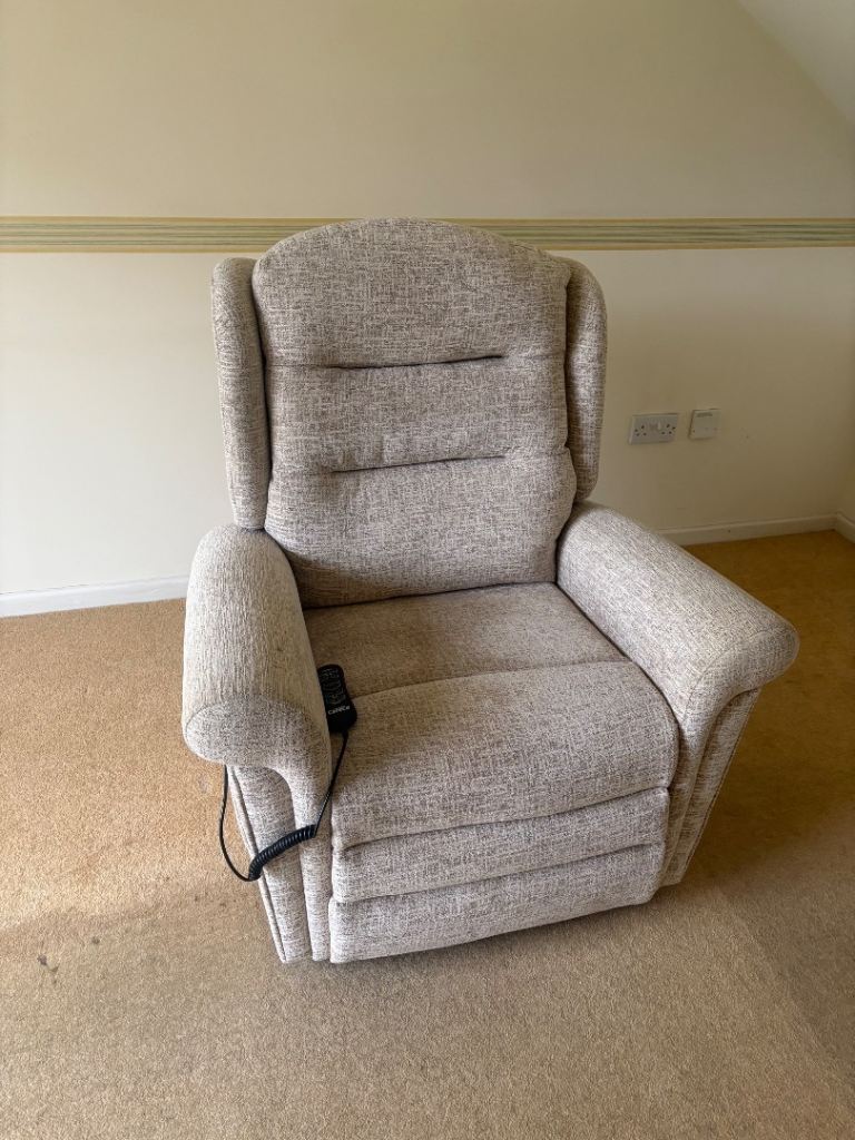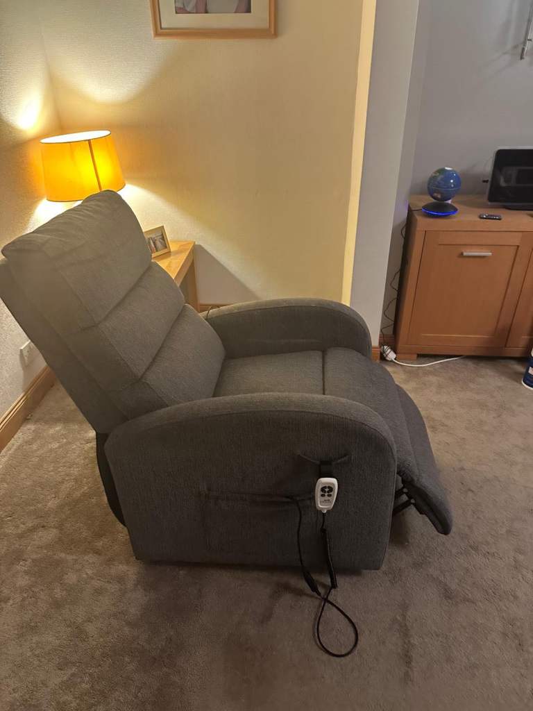 Grey fabrics Rise and Recline mobility armchair.