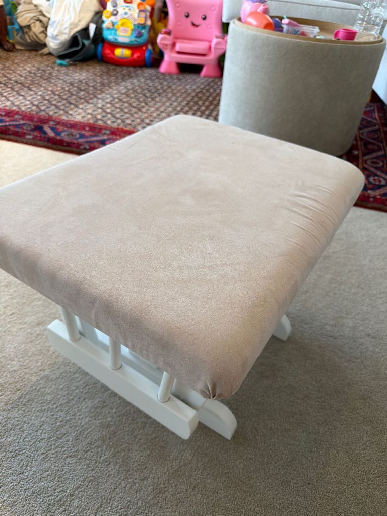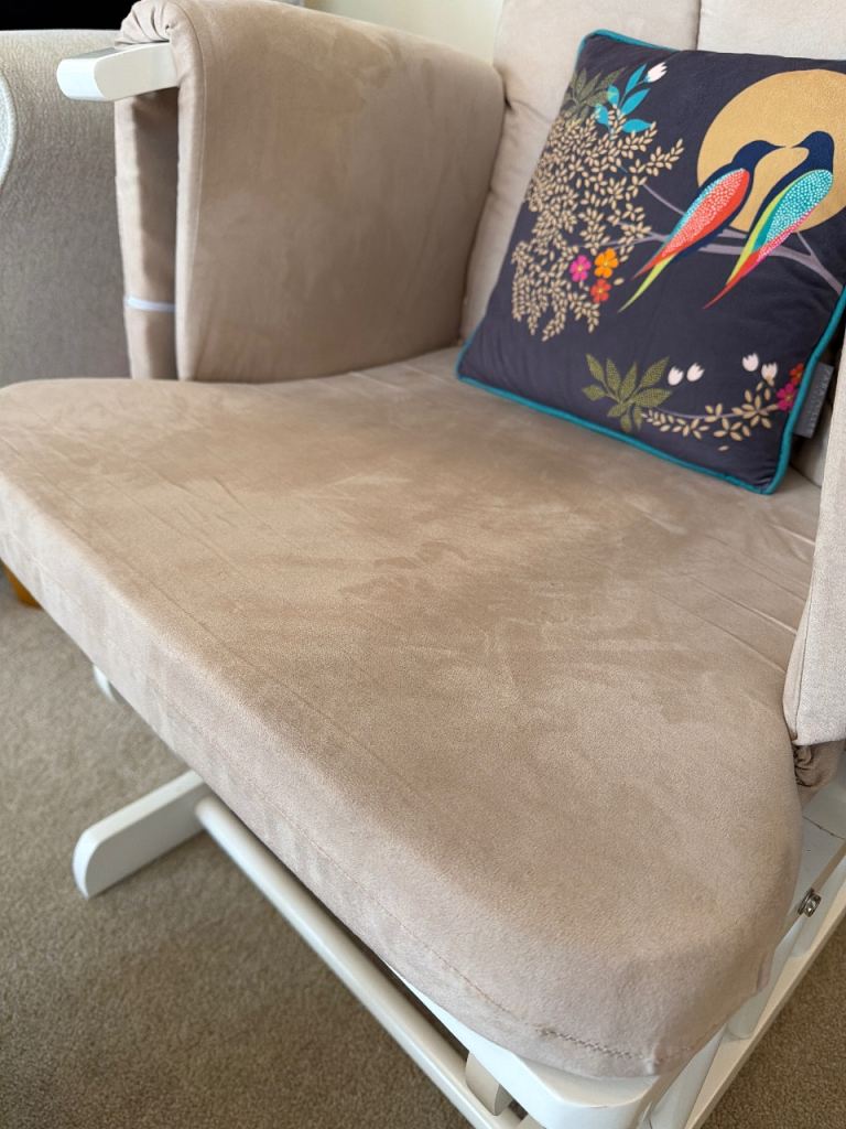 Rocking chair bought new two years ago. Hardly used at all hence GREAT condition - PRACTICALLY NEW! No chips or discoloration. The chair reclines to multiple positions and has a newspaper holder.