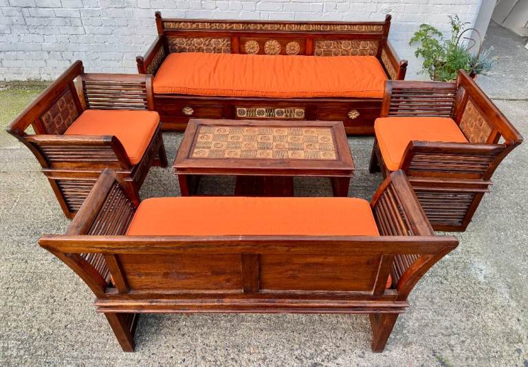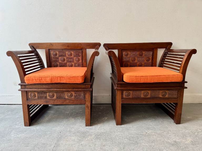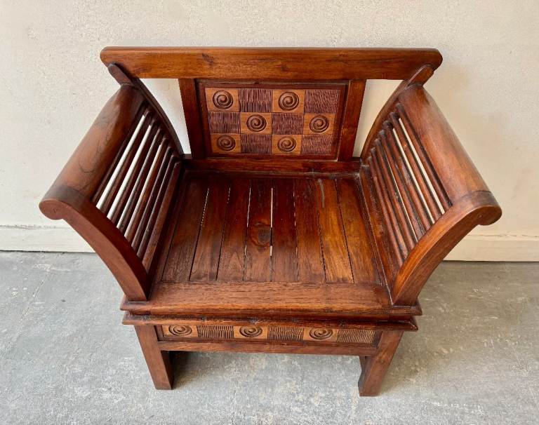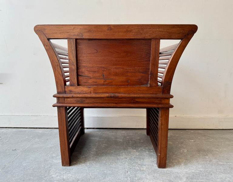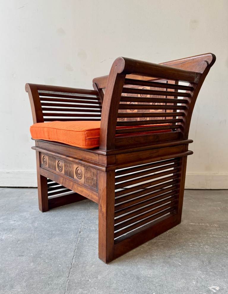 The design shows clear influences from Indian or Chinese furniture traditions, with sculptural arms and decorative panels that give it strong visual presence while remaining comfortable and practical.