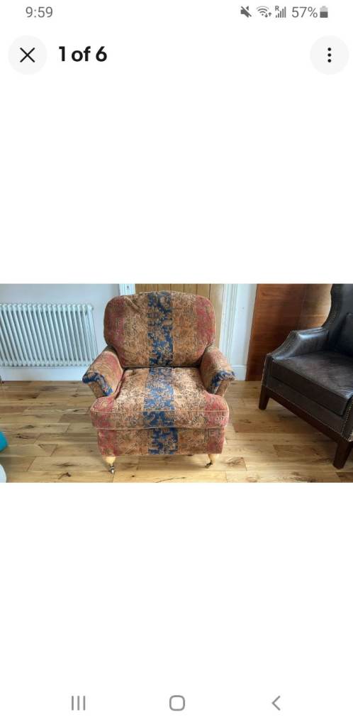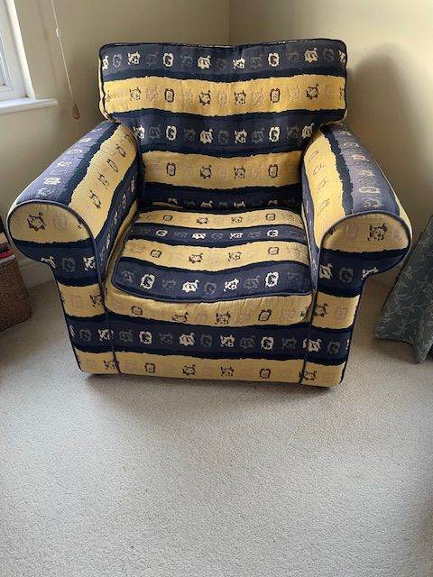 The chair is in nice overall condition, with light wear consistent with age and use. Another matching chair is available, along with 2 coordinating sofas and coffee table, all sold separately.