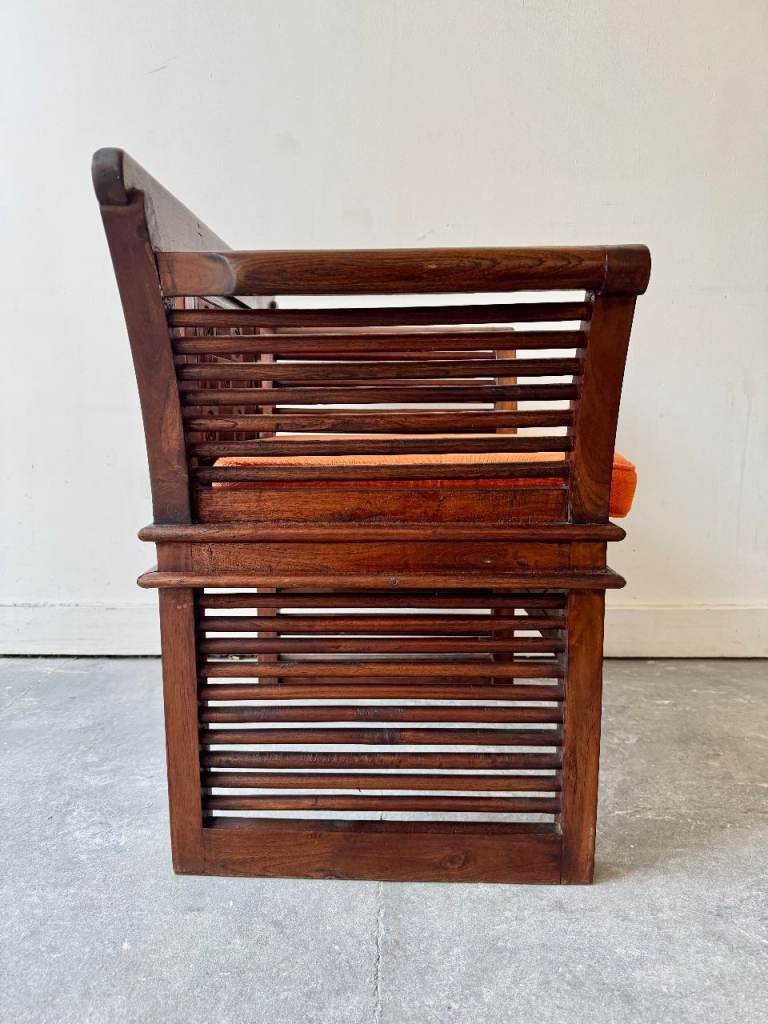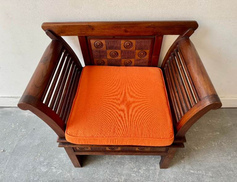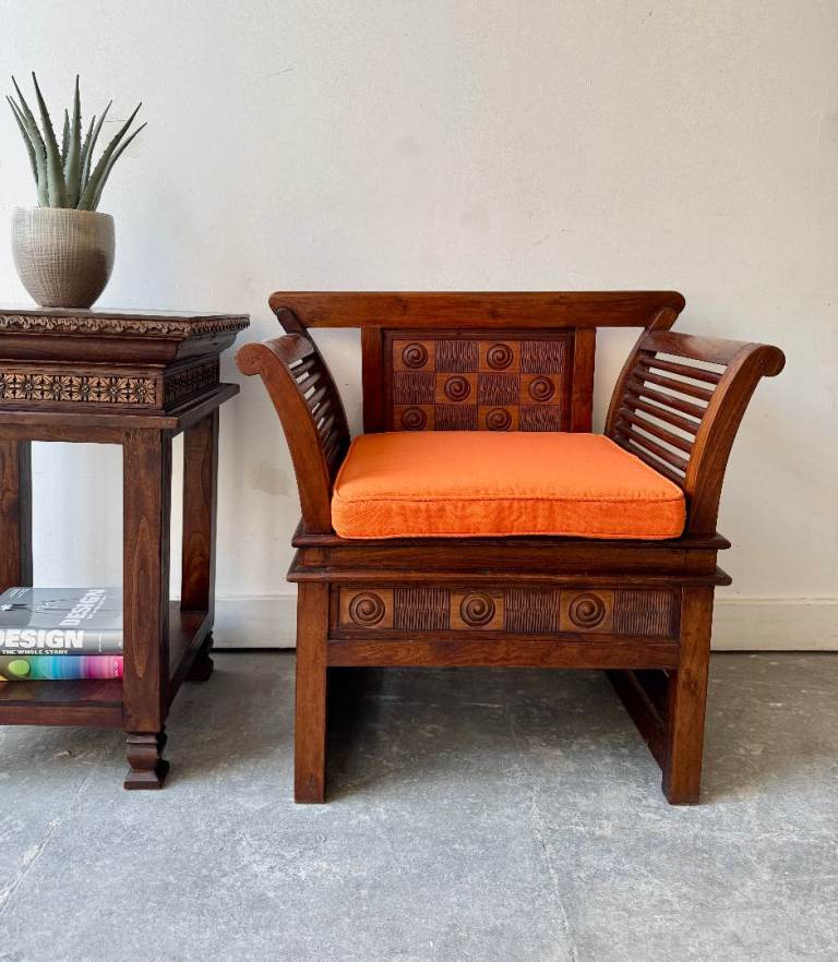 A striking wooden armchair, possibly constructed from sesham wood, featuring beautifully carved detailing and a warm, rich tone. The chair is complemented by a removable orange seat cushion, adding a subtle pop of colour against the darker wood.