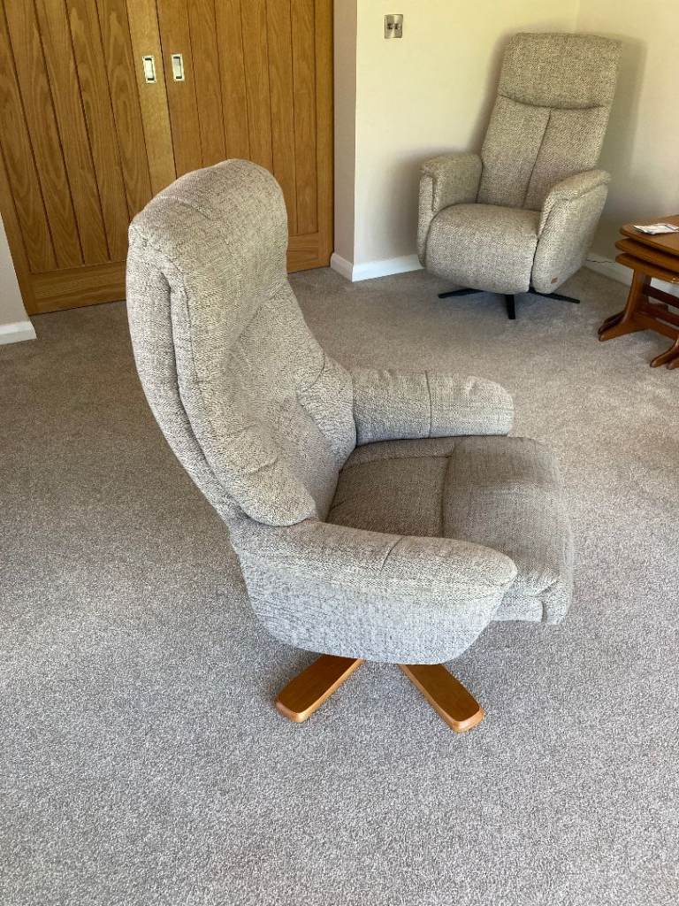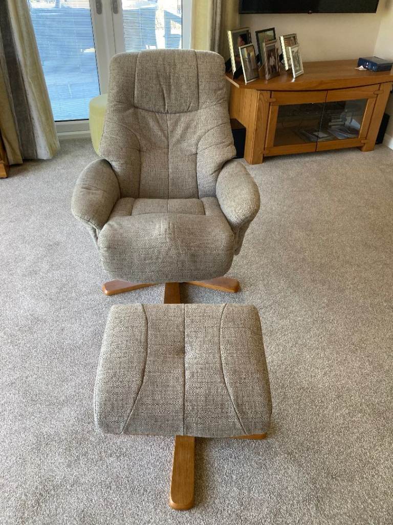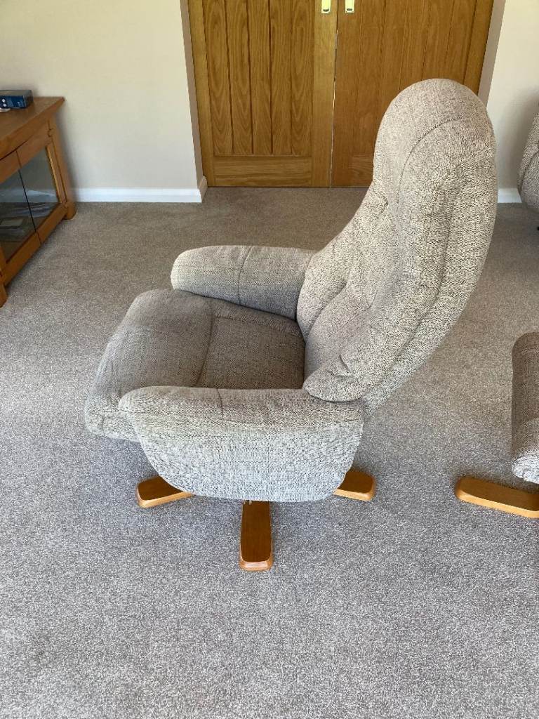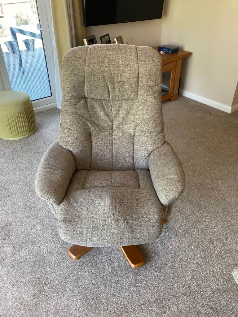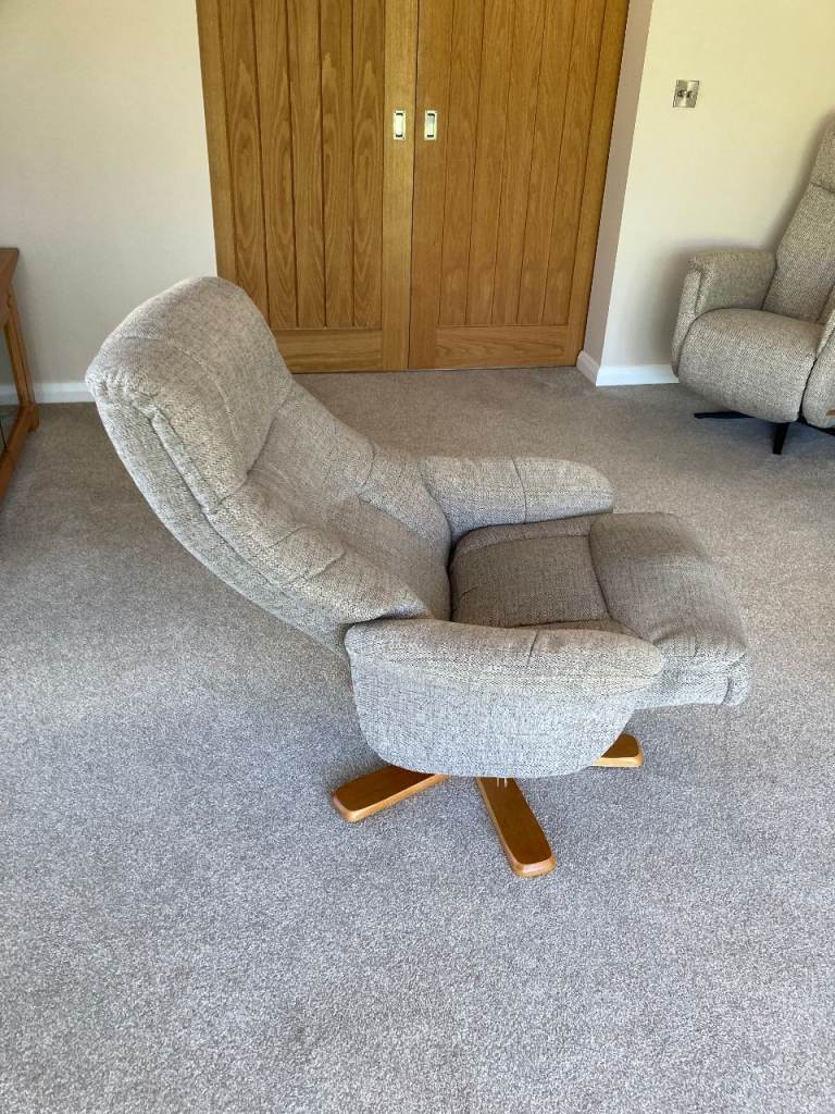 Excellent condition woven cloth reclining and swivel armchair with matching footstool. Upholstered in a neutral woven fabric in as new condition. Very comfortable and can adjust to suit individual.