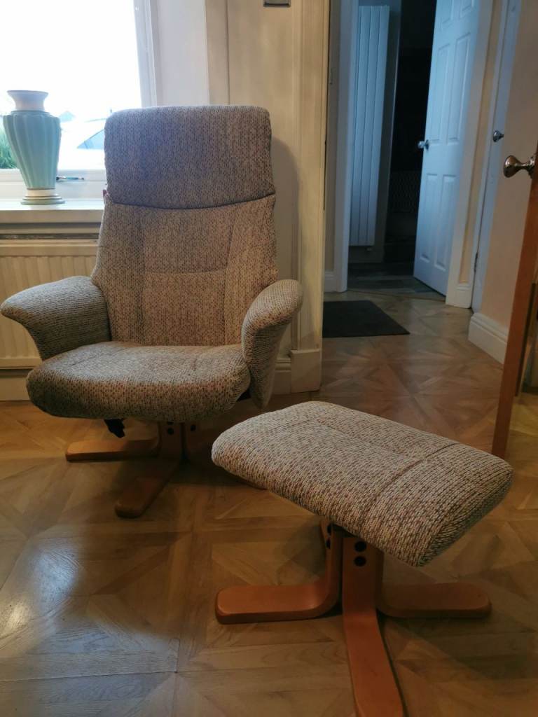 Neutral colour swivel chair with matching stool. Good condition.
