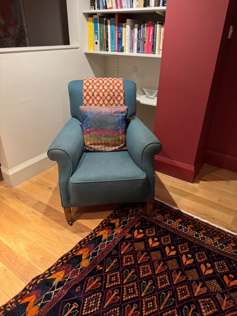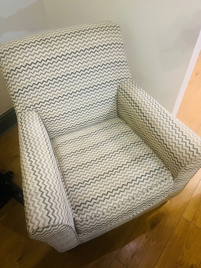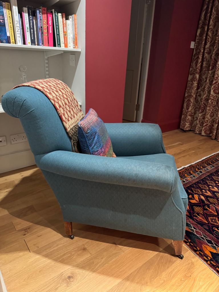 Comfortable traditional upholstered armchair. Wood frame but fabric upholstery