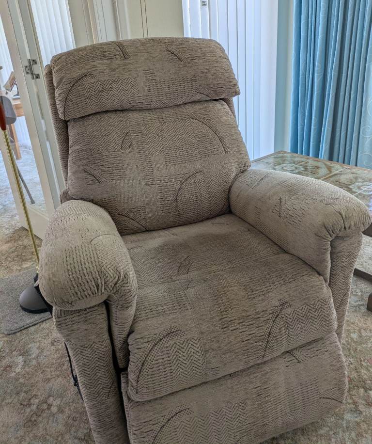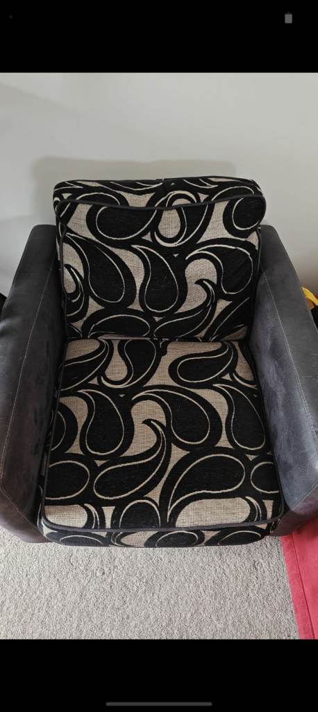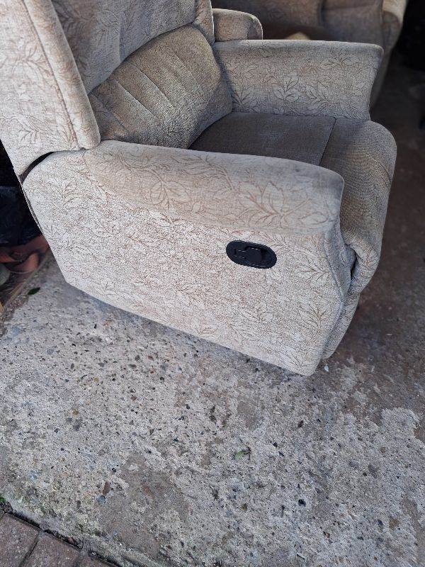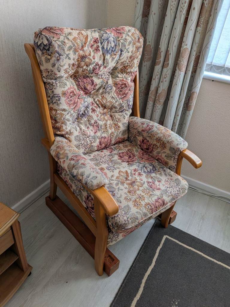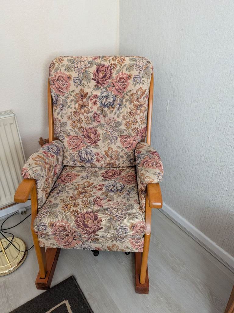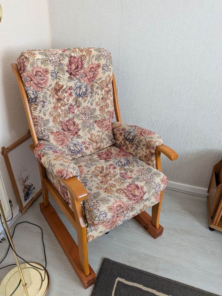 Two Armchairs for sale in soft cream and floral pattern. Fabric, wooden frame, also comes with bars so feet can be slotted in