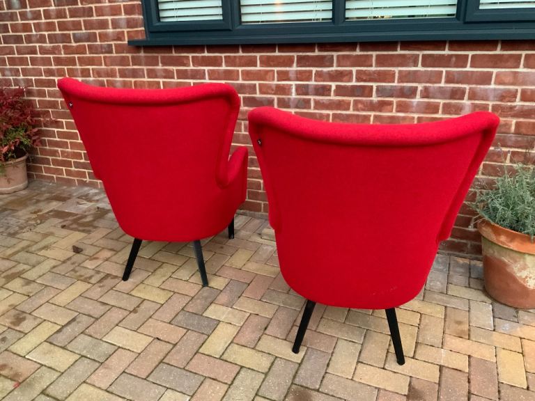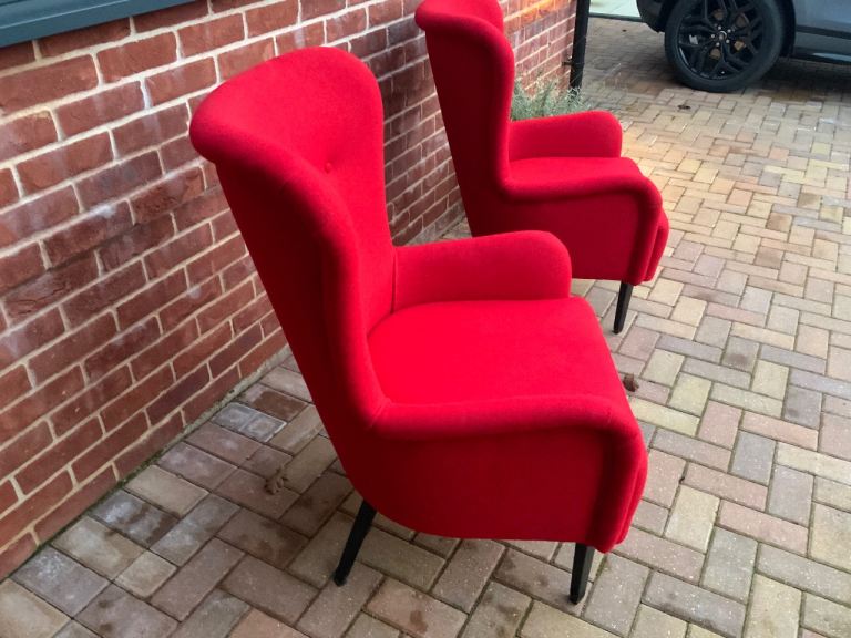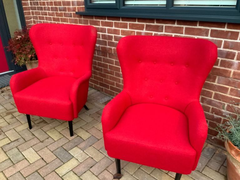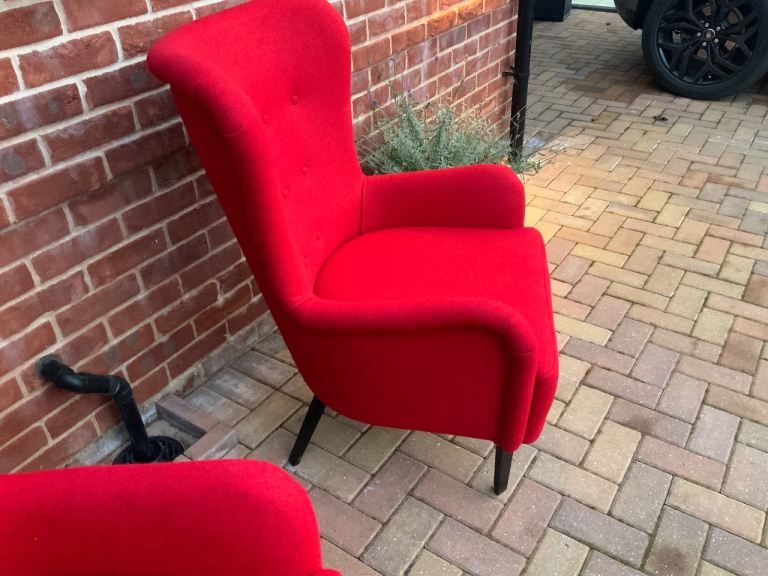 Two Highback armchairs for sale. Finished in a hard wearing red wool type fabric. These chairs are like brand new! £250 each or £425 for the pair. I can possibly deliver depending upon location for an agreed fee.