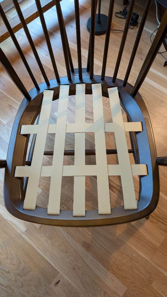 Current State: The image shows the chair without its original cushions, revealing the Pirelli webbing seat base, which is used to support seat foam.