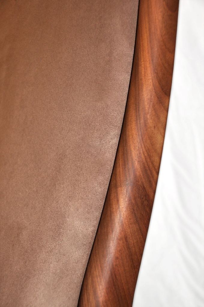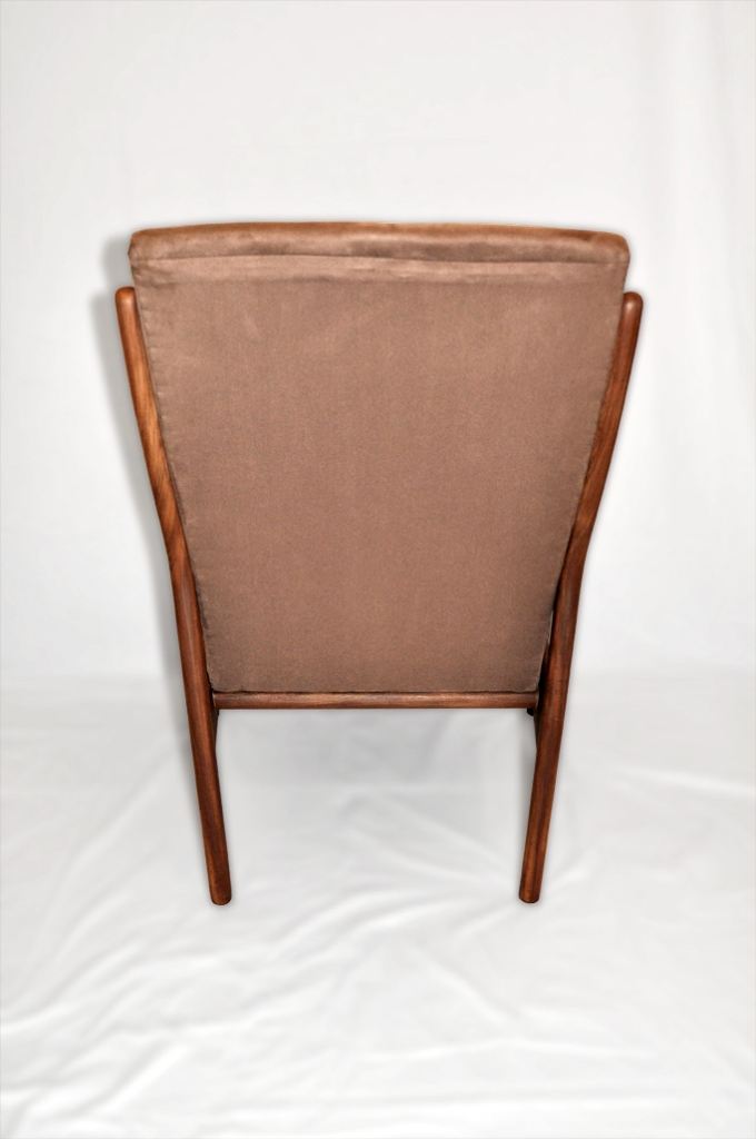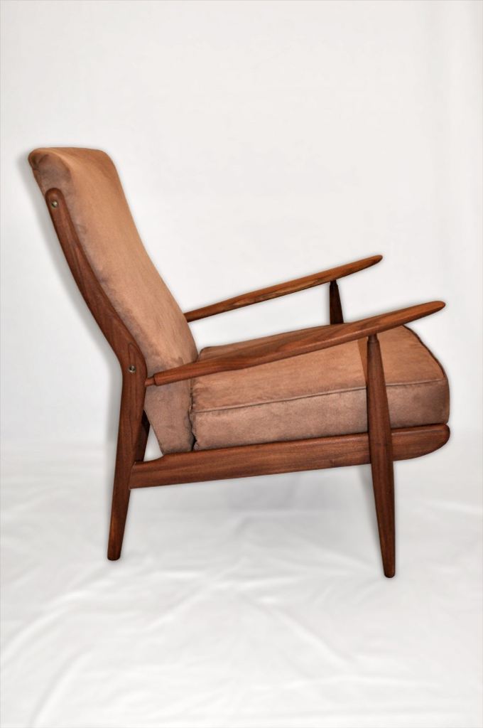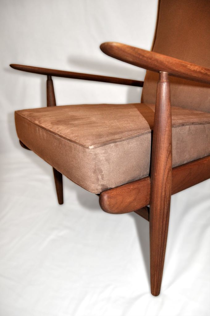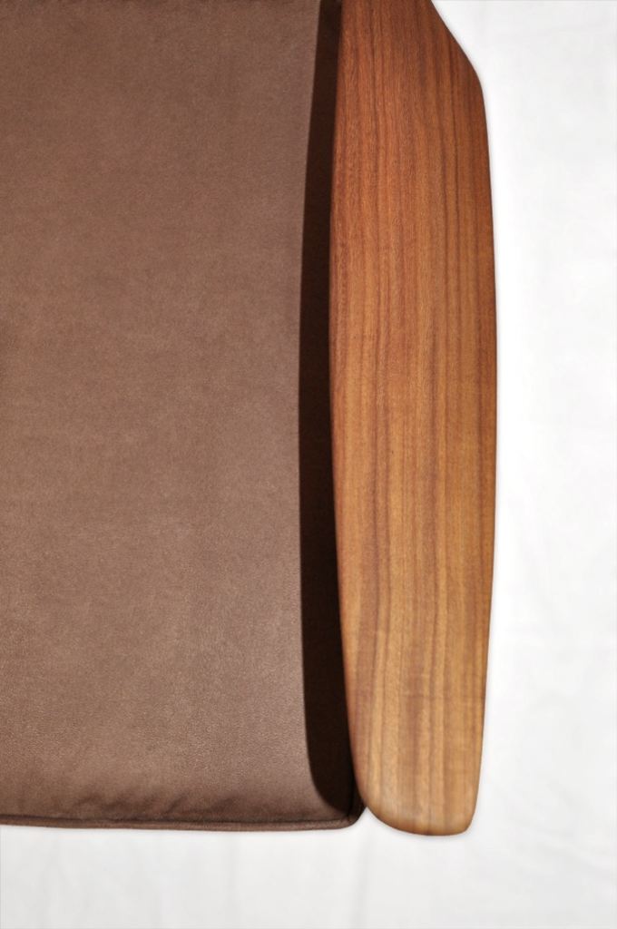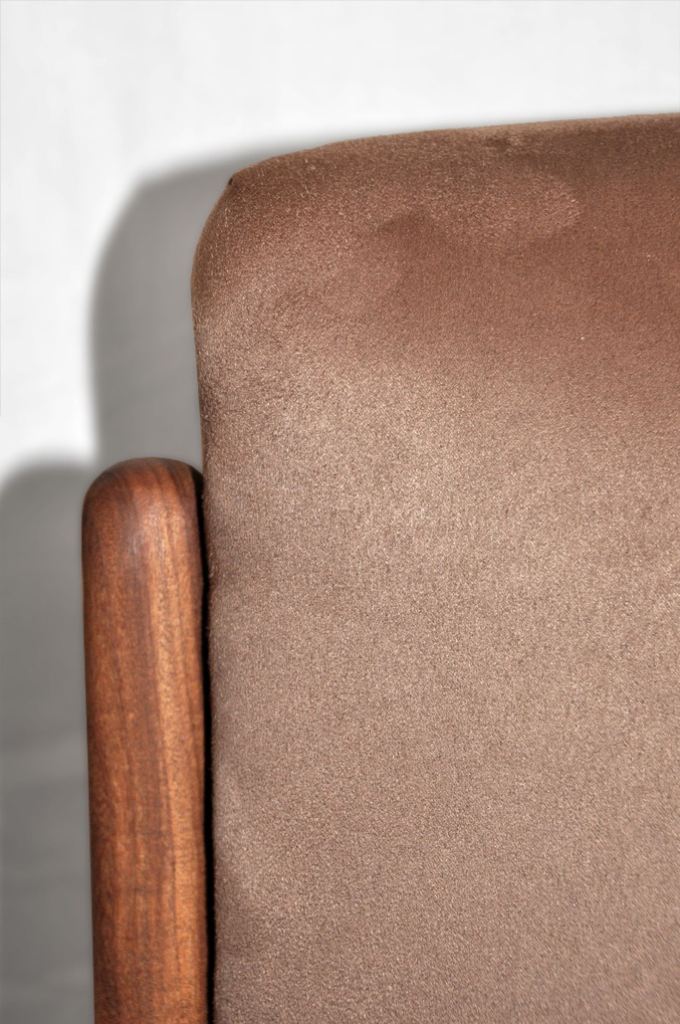The armchair has a solid afromosia (african teak - which ranks among the most valued tropical timber species) frame, with sculptural Wegner style curved armrests. The cushions covers are in light brown microfibre fabric (kind of suede effect). It is a very dynamic shape, as can be seen in the side view.