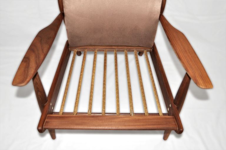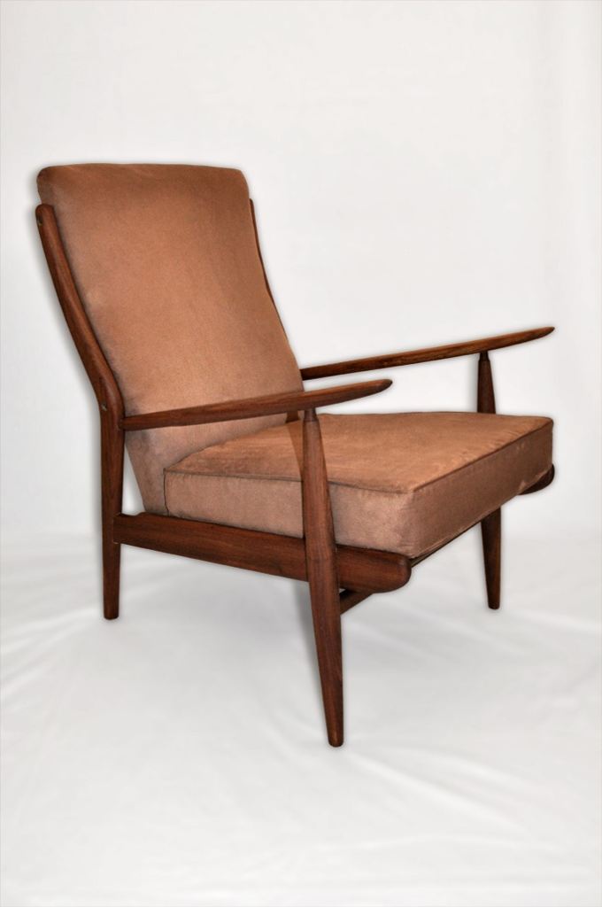 The armchair has been professionally restored to its original condition (restored frame, new foam pads and upholstery)and is being sold in as new condition. The only signs of use can be still seen on support springs which are intact and in good condition making it very comfortable to sit on. It has brand new upholstery in a light brown microfibre fabric, and compliments the solid afromosia frame beautifully. The seat cushion has been made with zips allowing it to be laundered professionally when needed. The frame has been striped of all old oil, any dents or scratches removed and re-oiled to a pristine condition. It is free of any damage, splits, repairs or wear to joints. The frame shows now the warm honey tones and wonderful grain, great mid- century modern design with all emphasis on form and function, with a low slung feel and upturned paddle/oar arms typical of this era - very Wegner!