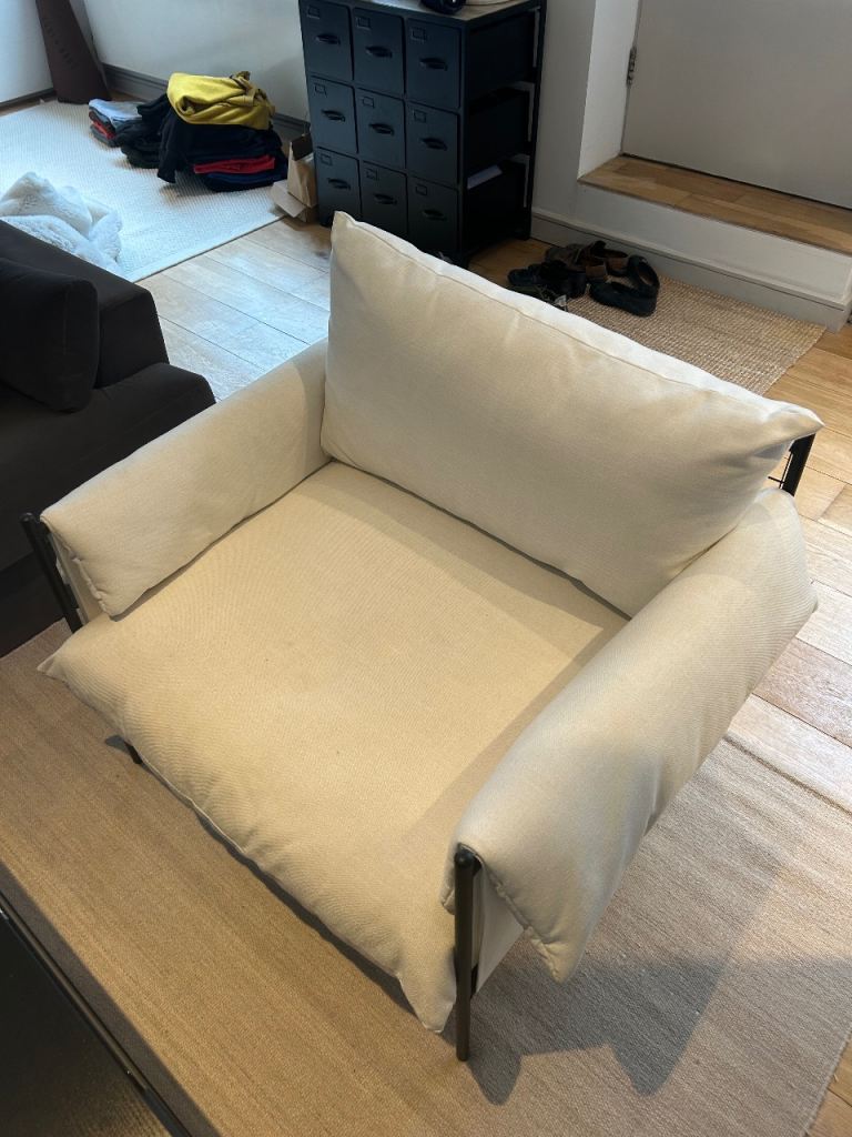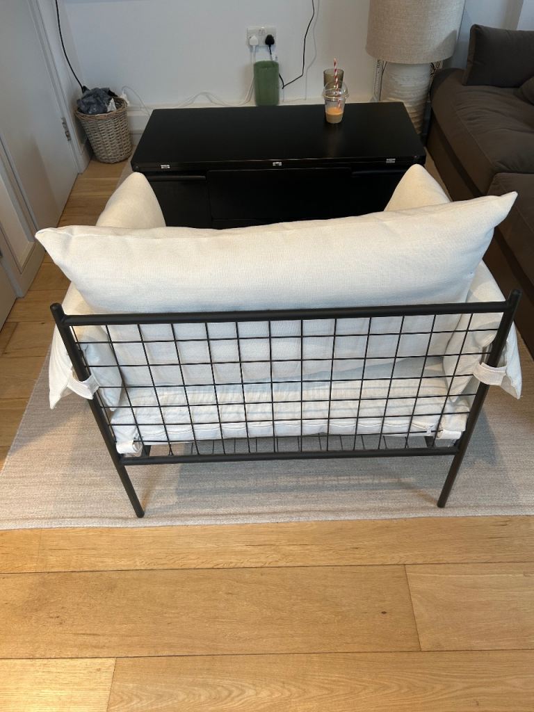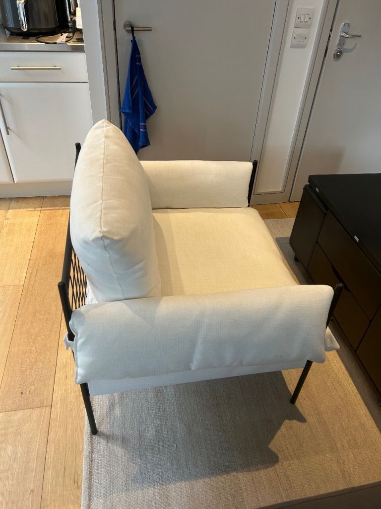 Collection only. White armchair in canvas and black metal. Great condition - a few areas could do with a spot clean.