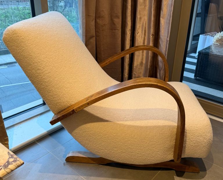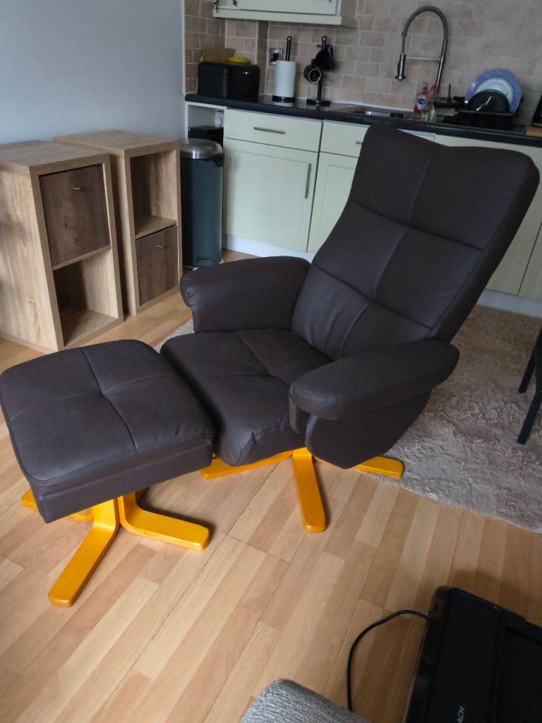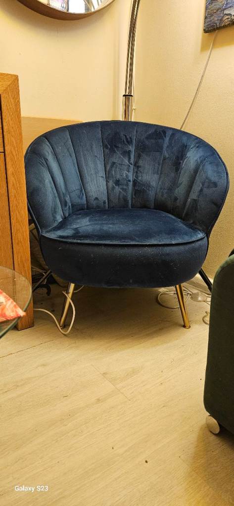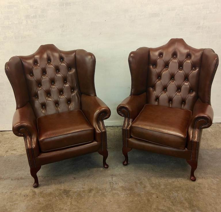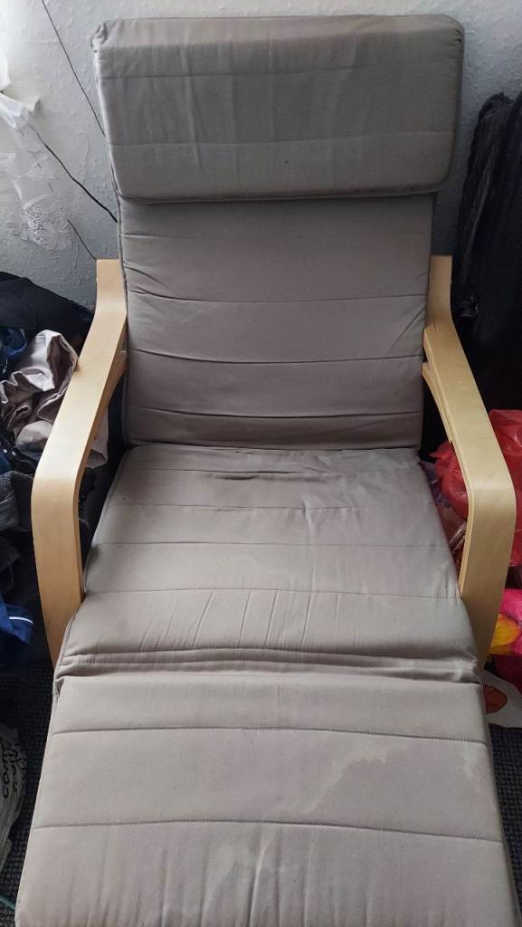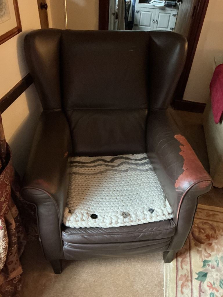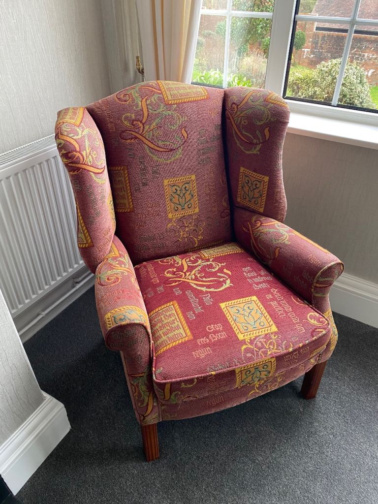 Solid wingback chair. No damage to fabric or frame. Material has faded over the years, so will need recovering at some stage. Lovely solid chair.