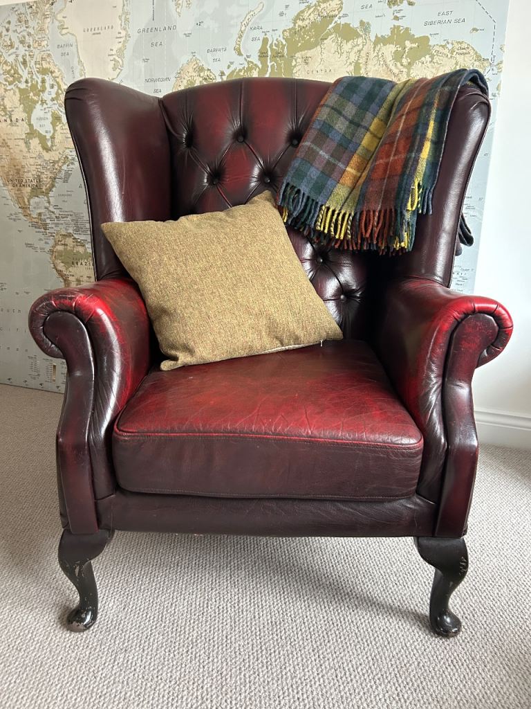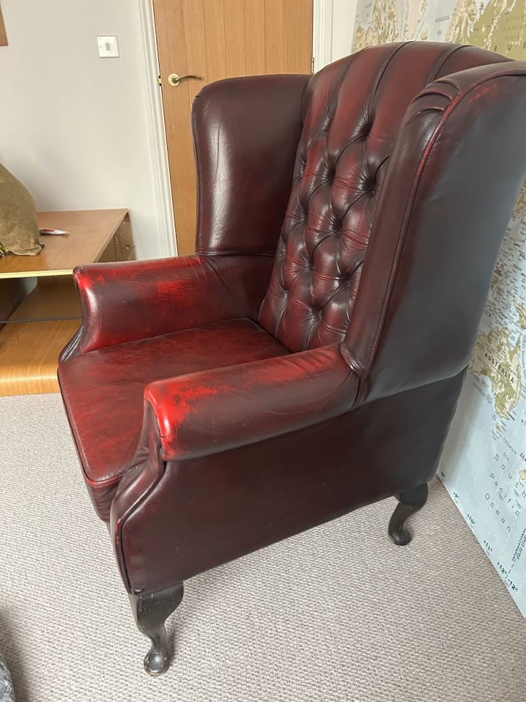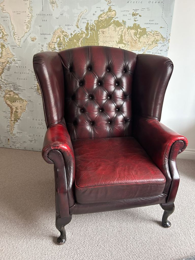 Wing back chair in ox blood leather. Very sturdy, in great condition with patina to match the age.