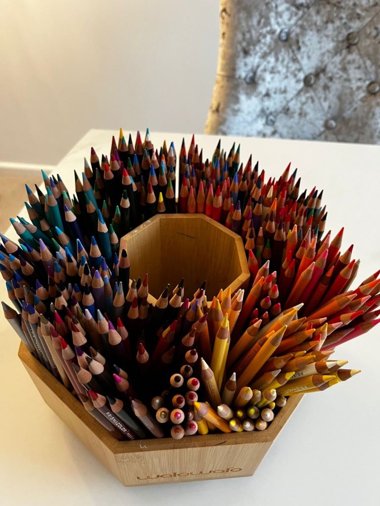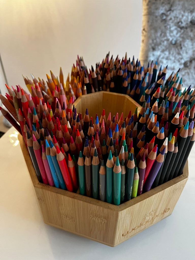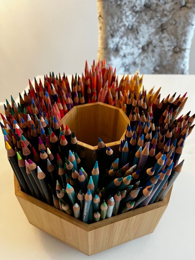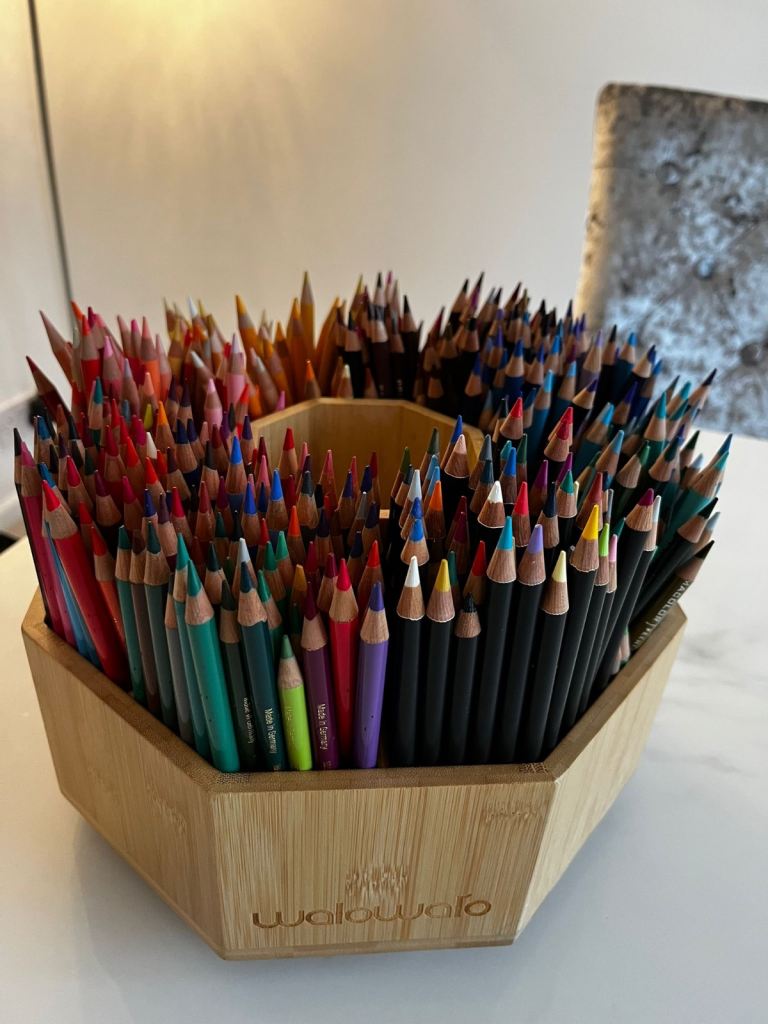 The pencils are stored in a solid wooden desktop holder, which is included in the sale.