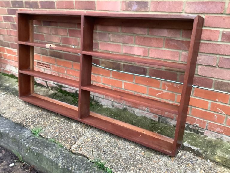 Teak bookcase ,sold wood . very strong , ideal for numerous paper backs or to display small items.