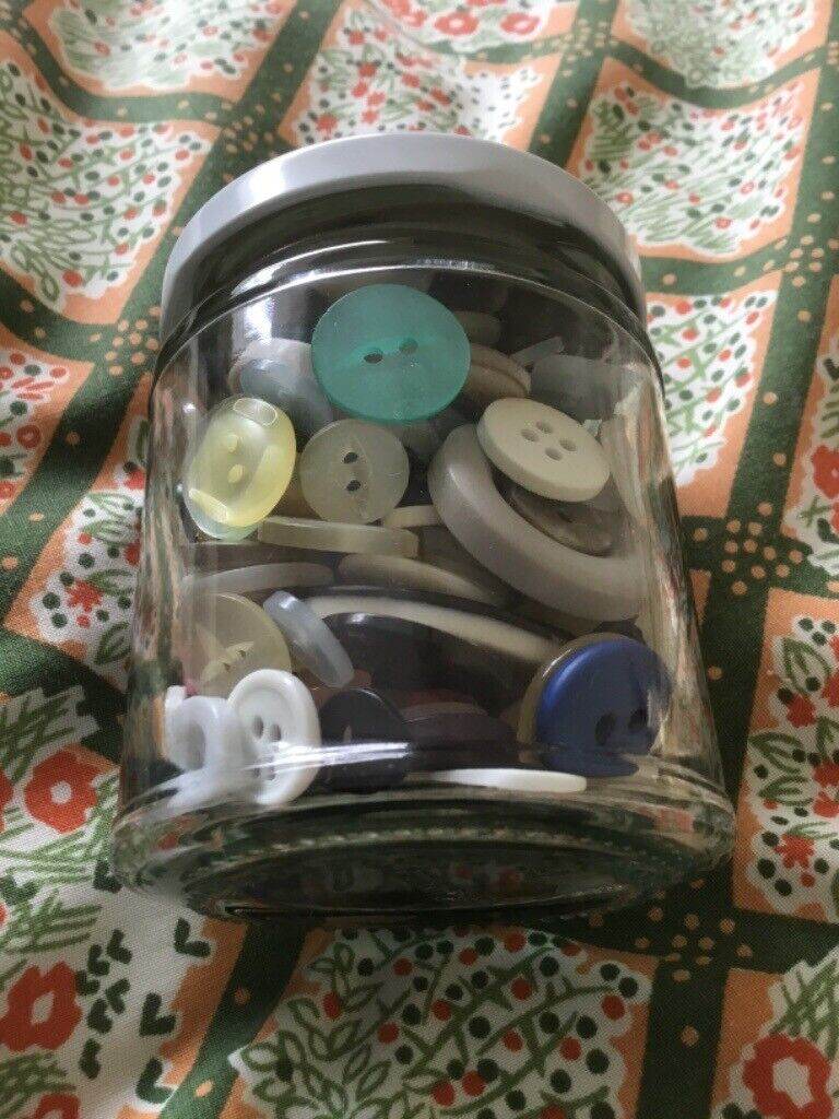 A jar of buttons in a Lakeland jar which is brand new. I have more buttons. I can put them in bags. All different sizes and colours. Mainly plastic, but have metal ones too. Let me know if you want anything in particular. Some brand new still on the card.