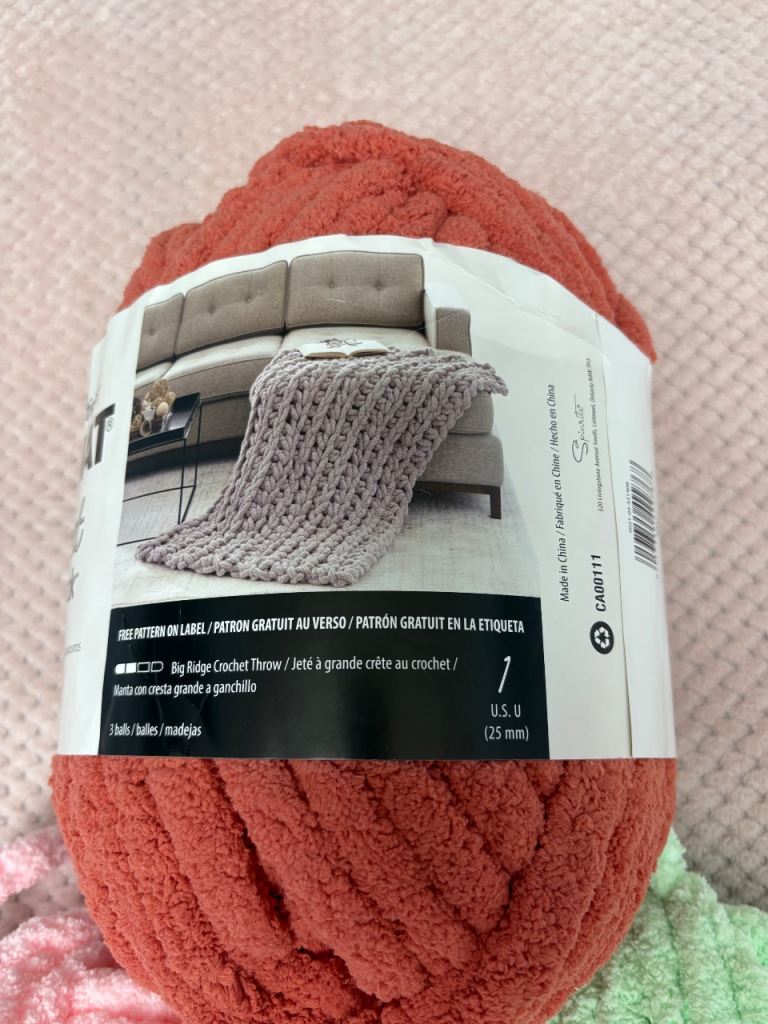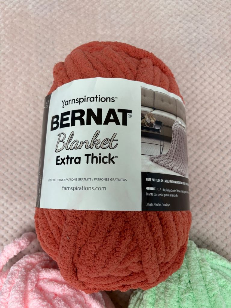 The Bernat yarn includes a blanket pattern on the label and recommends a 25 mm hook, making it ideal for quick chunky blanket projects.