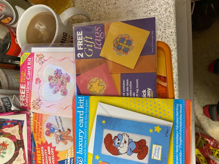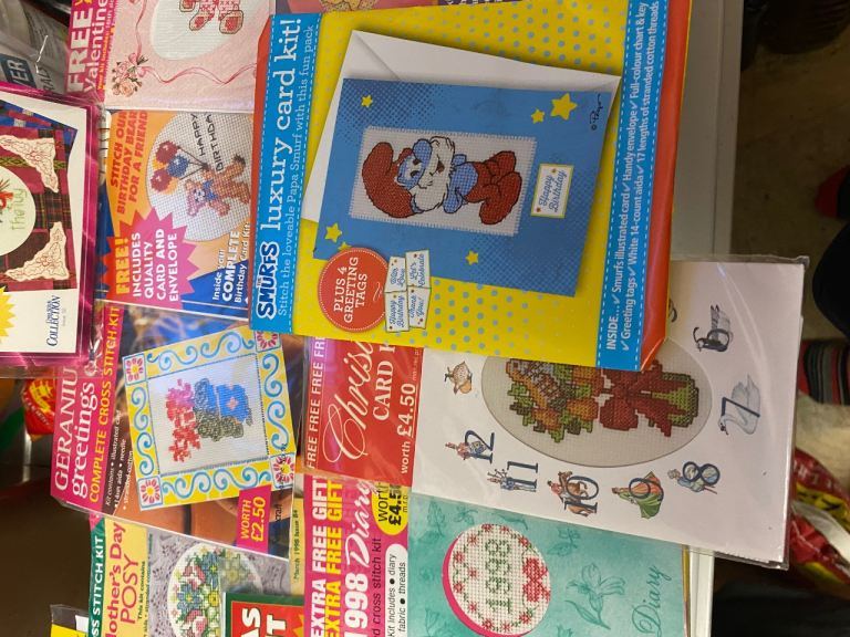 The items include complete kits for making greeting cards with designs like a teddy bear, flowers, and a Smurf.