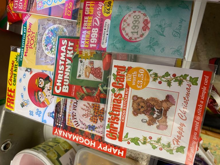Some kits are branded as "The World of Cross Stitching project packs" and include materials like aida fabric and cotton threads.