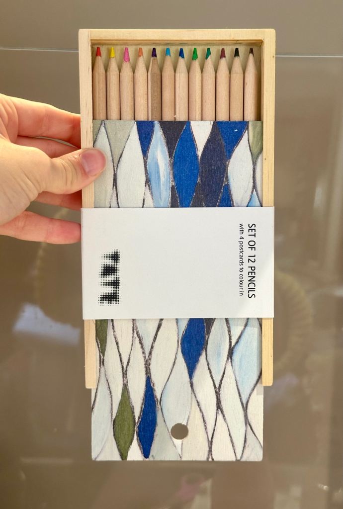 Set of 12 colouring pencils with postcards to colour in. They are brand new from Tate Modern. They come in a wooden box as seen. Postcards are from Lubaina Himid collection.