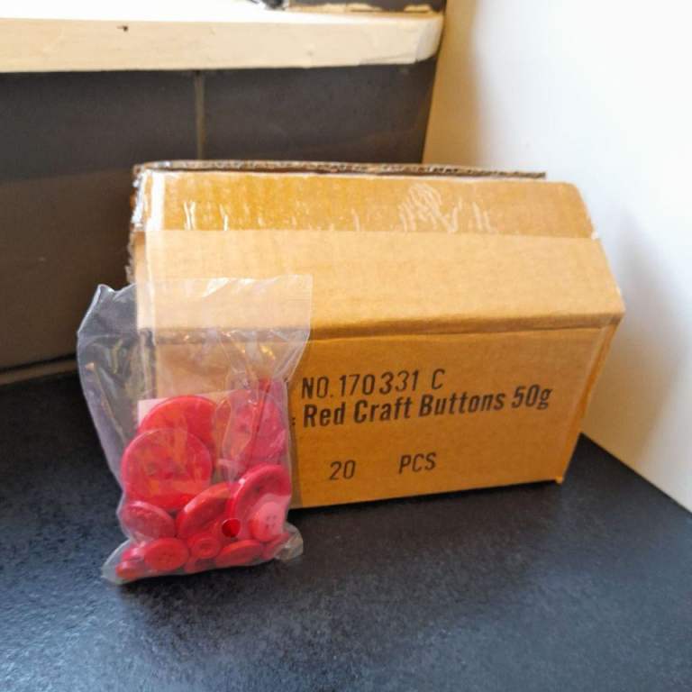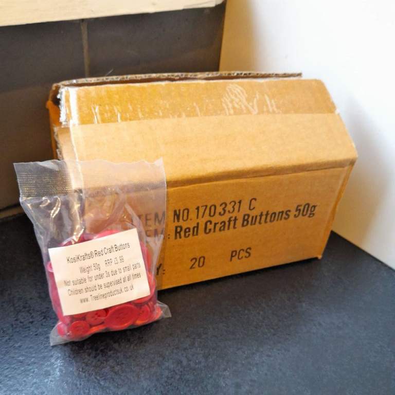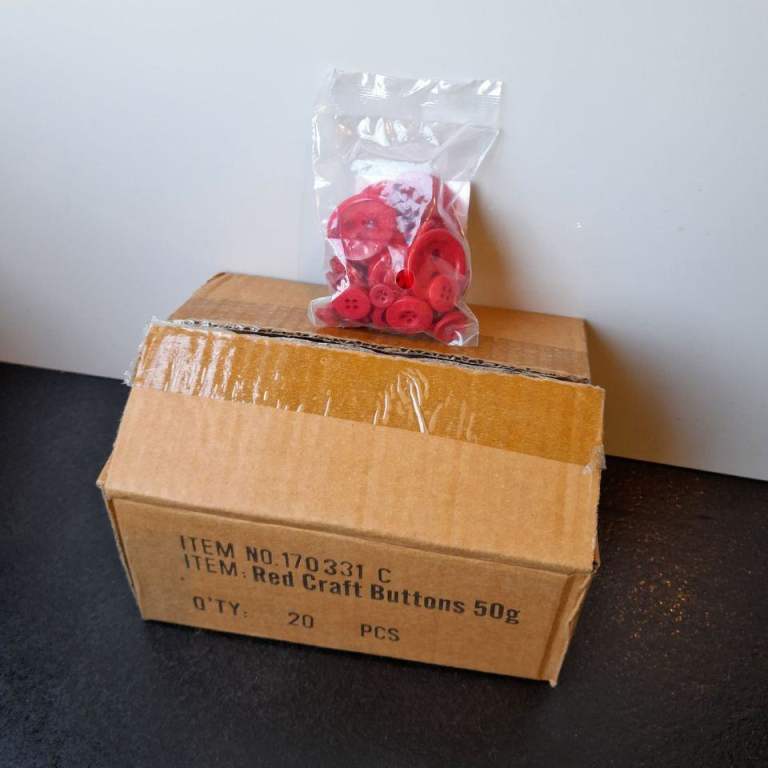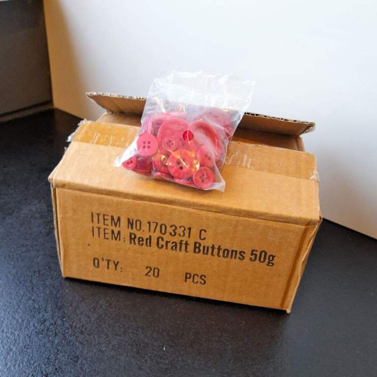 Price is for a box of 1kg red craft buttons / Inside the box is 20x 50g bags (sealed) / Style and size of buttons vary, the shade of red varies slightly too / RRP (of box) is £79.80 / Can also sell the bags separately, if wanting a lower quantity