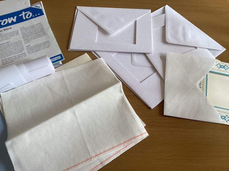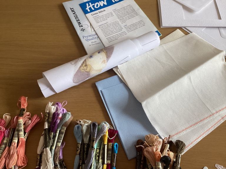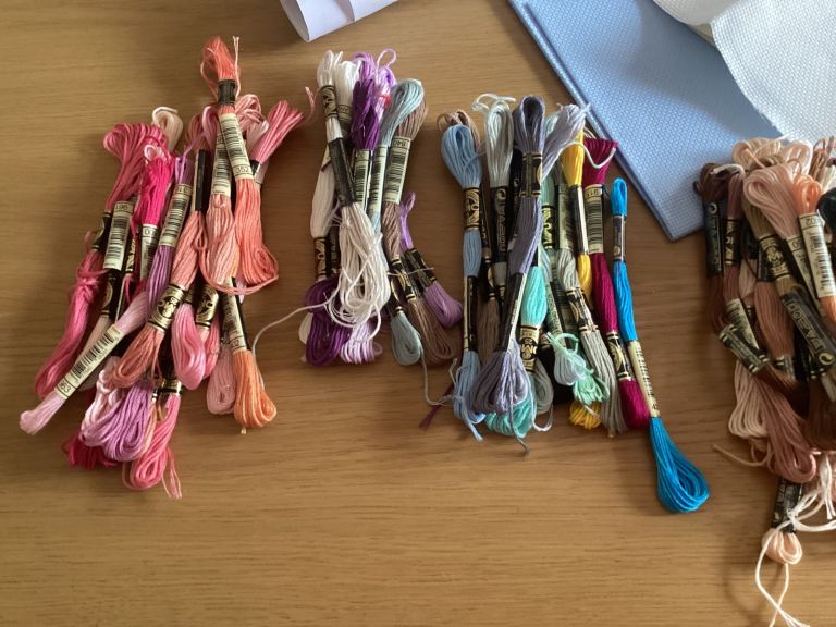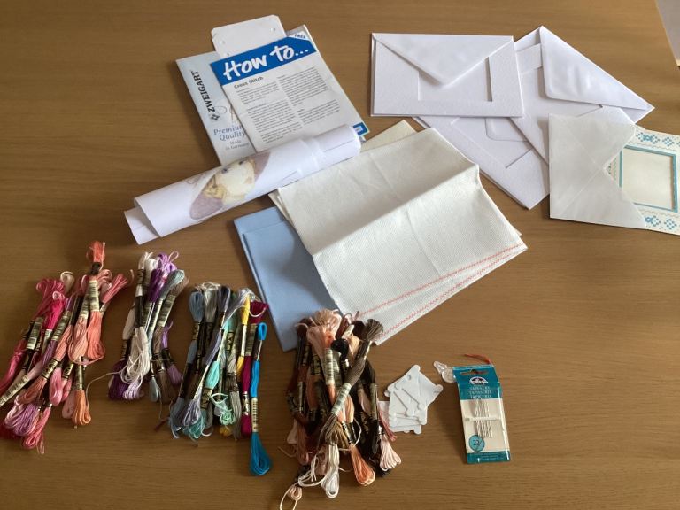 Selection of over 50 silks, mounting cards, needles, needle threader, how to embroider guide, patterns and fabric.