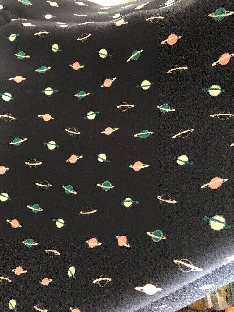 Rare find. From autumn/winter 2013 designer collection. Dark blue, print with pink, white, light blue and dark blue planets.