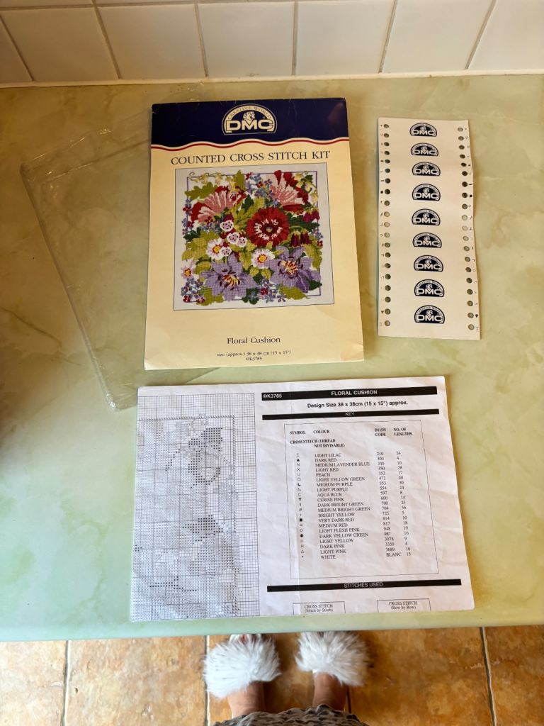 DMC Counted Cross Stitch Kit for a floral cushion.