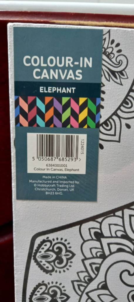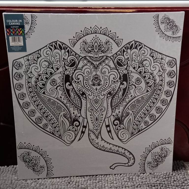 An Elephant colour in canvas which is brand new and has the wrapping attached. This is a 50cm square canvas from Hobbycraft, which can be mounted on a wall when completed.