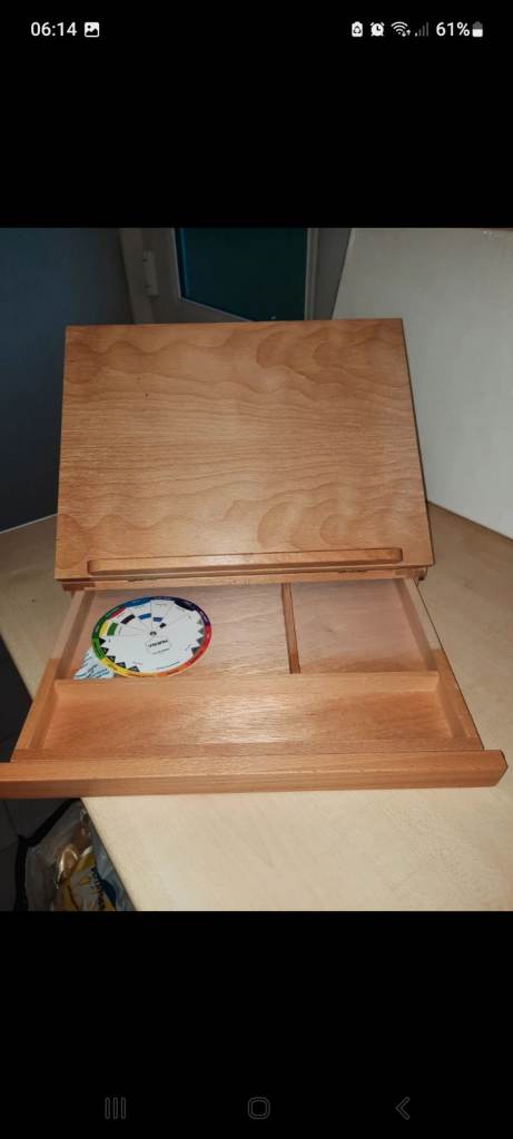 Also comes with canvases, brushes, a palette, and a wooden drawing board.