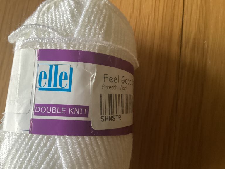 Elle double knit white stretch yarn. Acrylic and polyester. 7 x 50g balls.