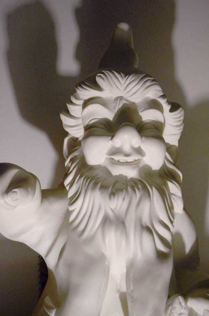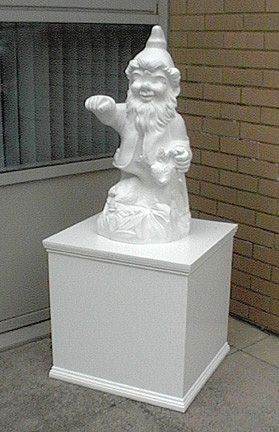 The 'standard gnome', a popular, though some may argue working class, garden 'ornament' has been transformed it into a classical form not only changing its appearance but its appreciation too. The resin figure was repaired and coated in satin white paint white to give marble/plaster like finish. The figure stands proudly atop a custom-made plinth, to further elevate its new importance and stature.