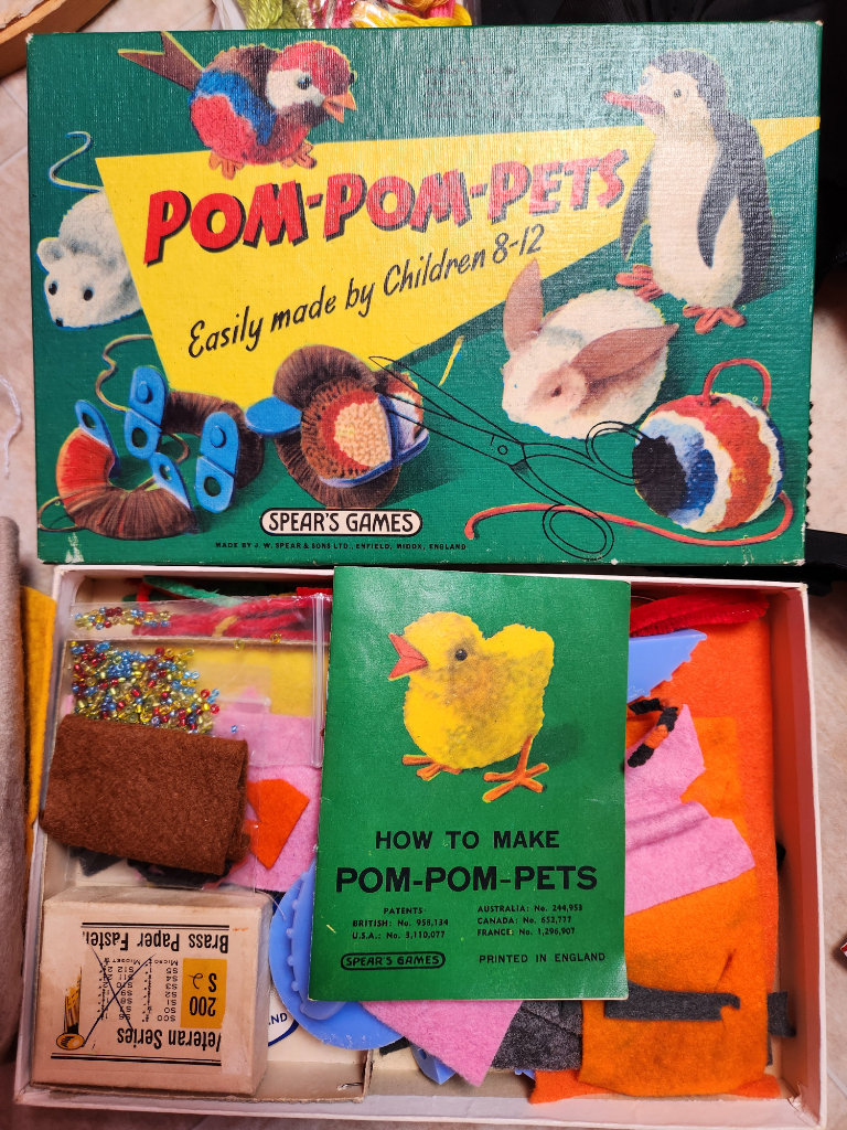 complete and in very good condition. Clip together pieces to make 6 circular pom pom sizes. Wrap wool around and follow instructions. Add bead eyes and pipe cleaner feet and felt beaks/ears. Says ‘easily made by children 8-12’; I did indeed have and use this as child but think I needed a little help! Instruction booklet shows how to make: chicken, robin, ladybird, mouse, duckling, swan, owl, rabbit, penguin, and pom poms. Kit also includes small scissors and scraps of felt and lots of new pipe cleaners. No wool included.