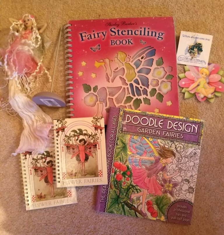 Fairy ornament, stencil and colouring books, 4 notebooks, handkerchief, brooch