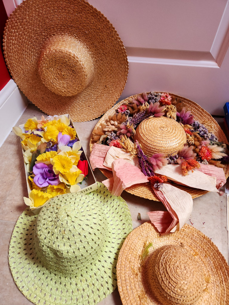 One has Easter eggs and feathers from school Easter parade but more decor could be added (maybe ribbon round brim to cover glue from where some feathers came off)