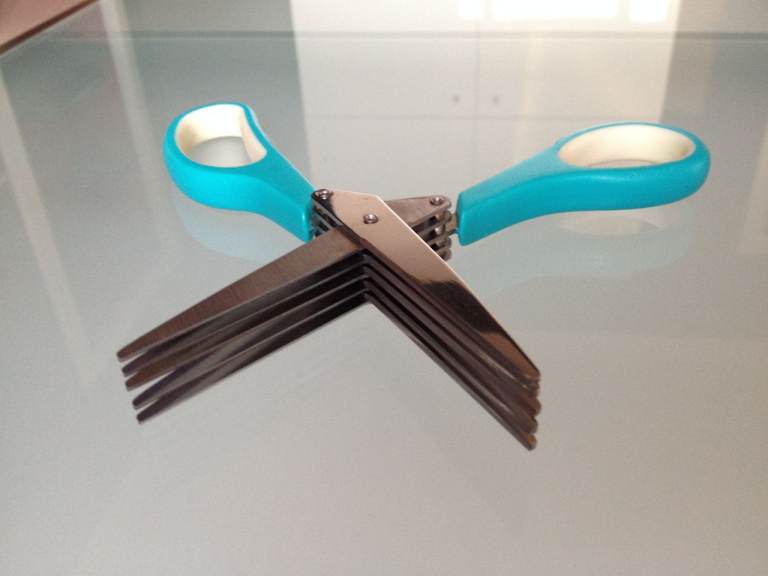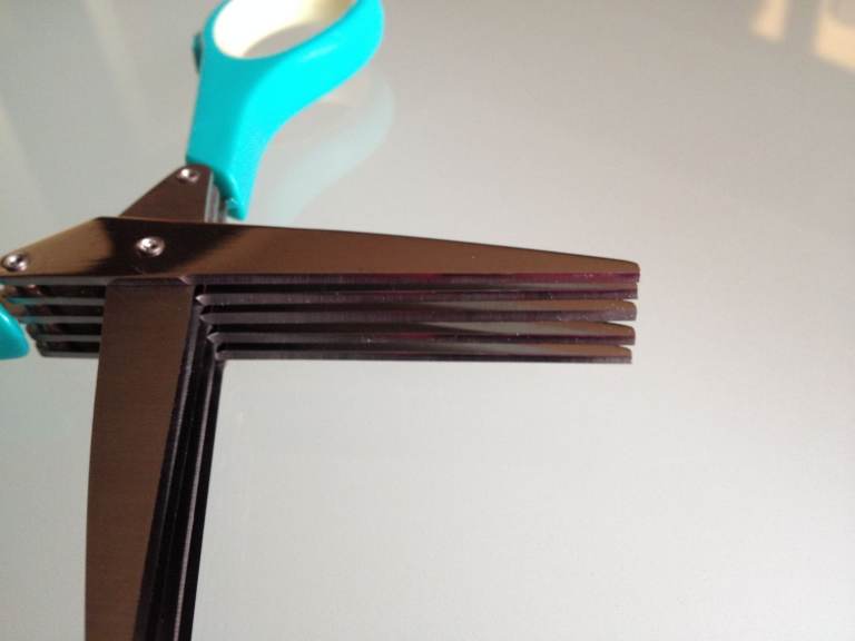 These multi-bladed scissors cut with 5 blades simultaneously.
