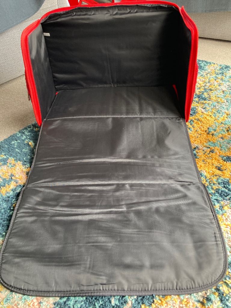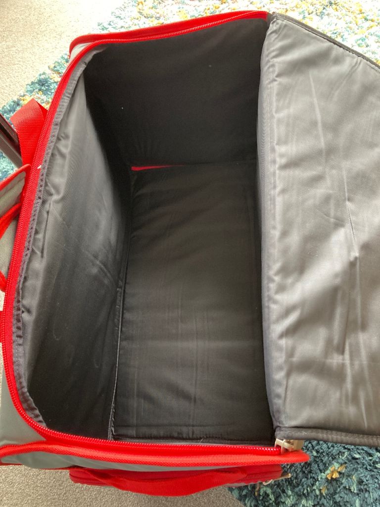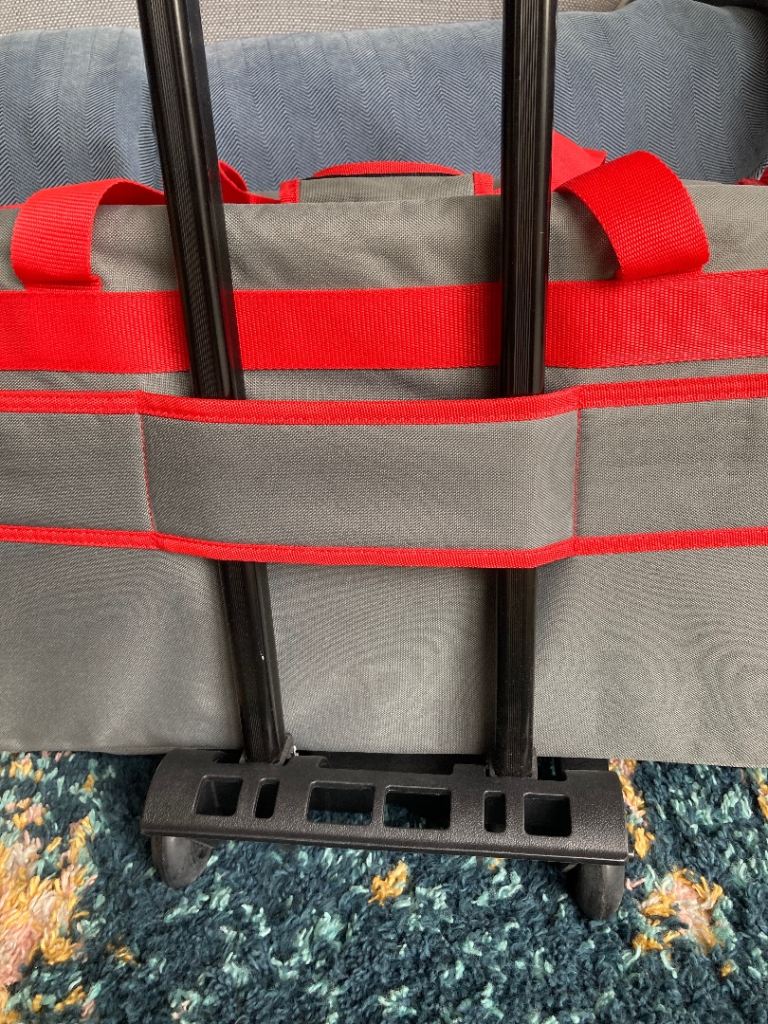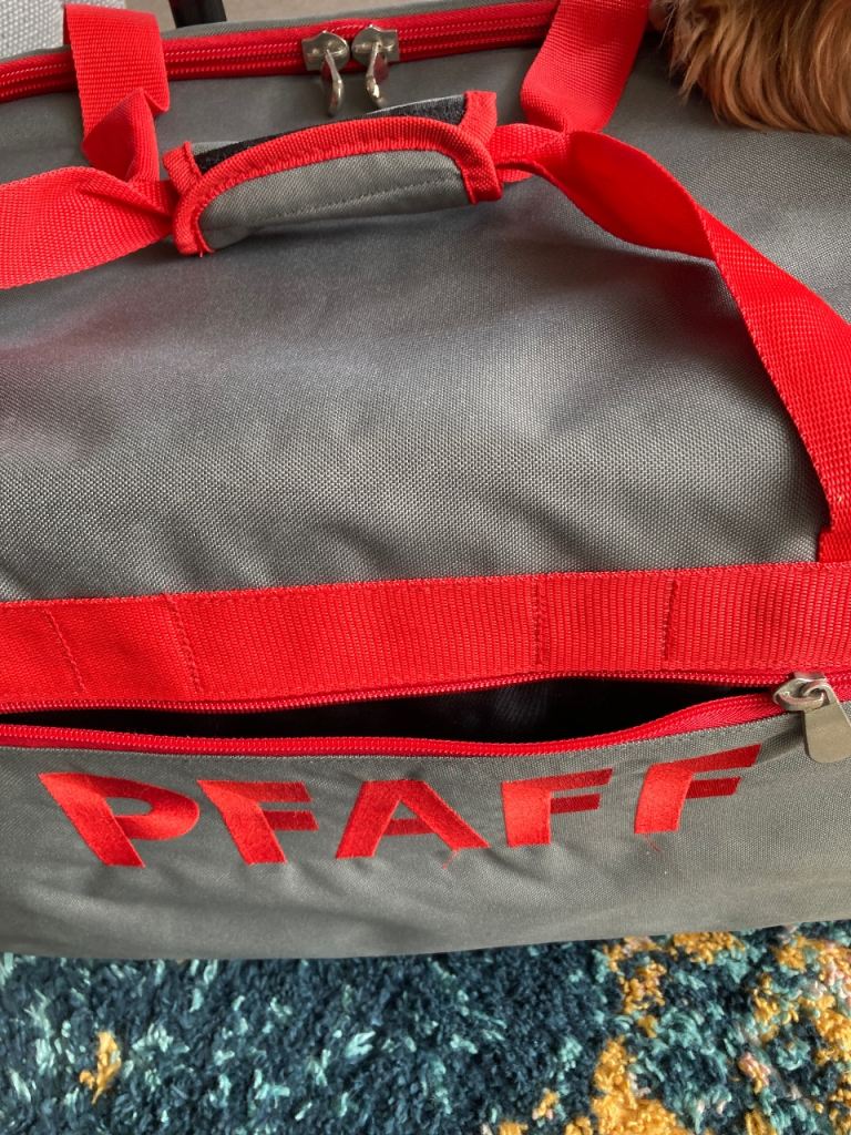 There is a wide strap to the back of the bag which slots easily over the handle of the Pfaff carry trolley, keeping it secure to transport safely.