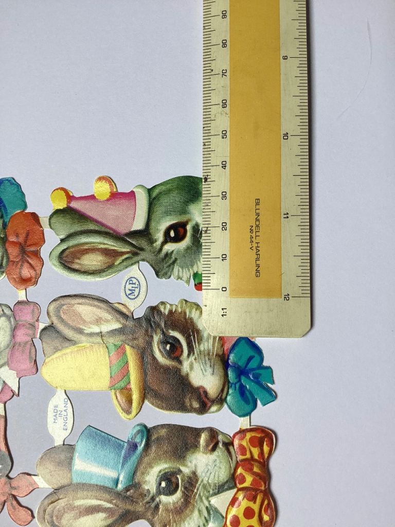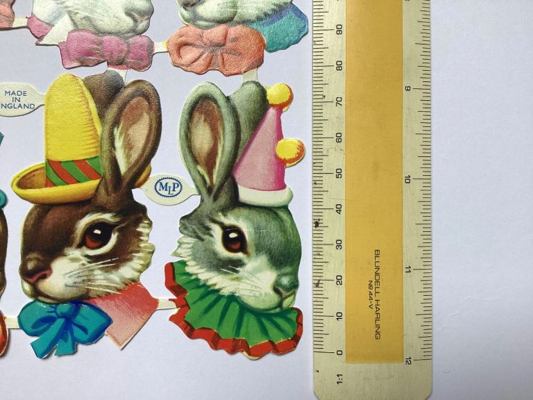 Unused rare 1960's vintage scraps. MLP 956 die cut rabbits for scrapbooking. Made in England by Mamelok. Rare opportunity for scrapbooker's to buy rare vintage scraps. The back show the aged thicker paper.