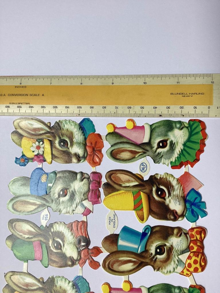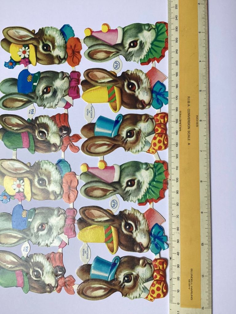 Approximately 24 x 15cm full sheet size. with 12 x rabbit heads per sheet at approx 7.5 x 3.5 cm each rabbit. These are older vintage scraps so may be minor upturned corners on some sheets