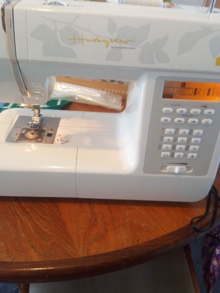 Husqvarna Huskystar C20 sewing machine. In excellent working order. With new foot pedal, hard cover, built in needle threaded, instructions book.