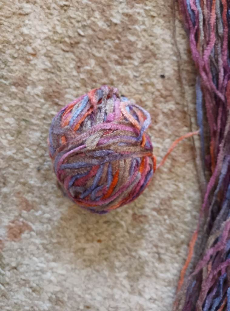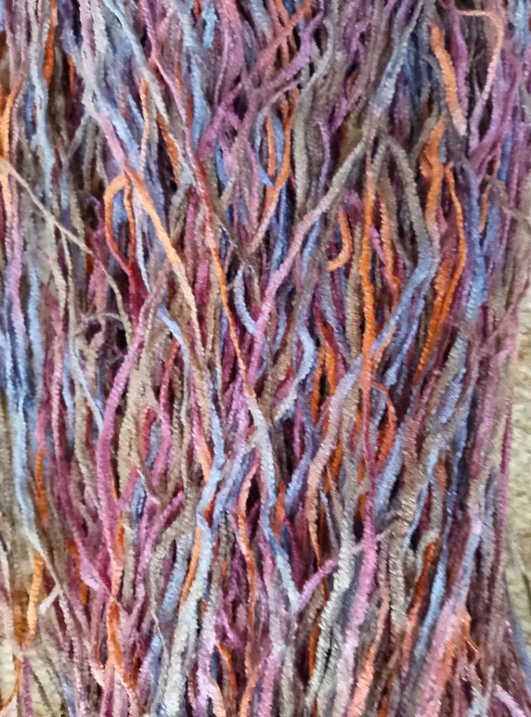 Skein plus one small ball (100 grams in total) of multi coloured chenille yarn. Skein is slightly ‘raggy’ at the bottom but should still wind okay! Brand new £4