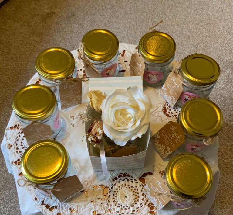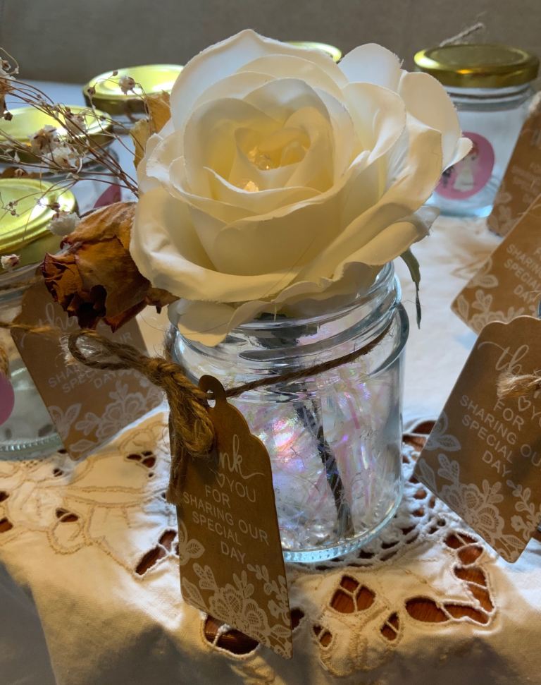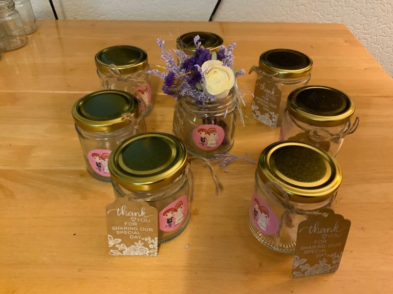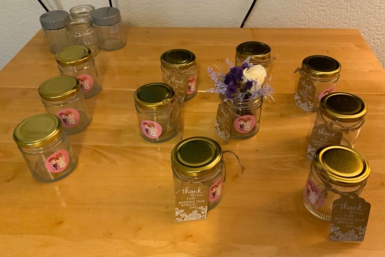 9 Wedding table jars , greetings labels ,. ( 4 jars extra for free)