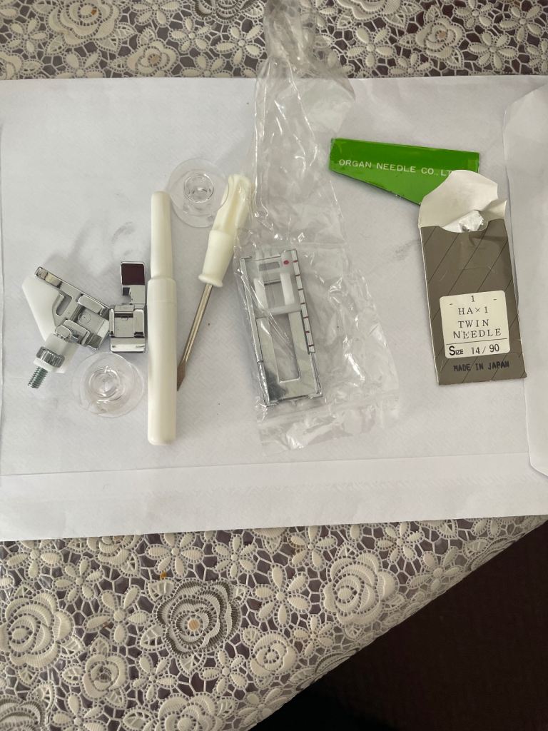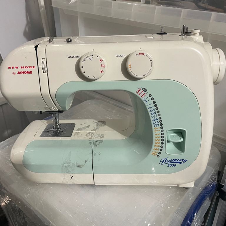 New home janome machine in good condition and working. Some tape marks.